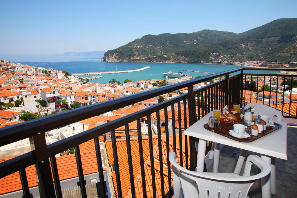 With its characteristic red-tiled rooftops and winding cobblestone paths, the Denise hotel, perched elegantly above Skopelos Town, offers expansive views of the glistening Aegean Sea and the charming town below. This Skiathos hotel features spacious rooms with all amenities needed for a comfortable stay. It has a satellite TV, a fridge, a private bathroom with a shower, and a hairdryer. Breakfast is served every morning, and enjoy the swimming pool for relaxation while enjoying the panoramic views. Visitors can easily explore the island's rich history and natural beauty from the main bus station, the port, and the center market, all within a 10-minute (10-meter) walk. With its winding lanes of cobblestones (sokakia), Skopelos Town is teeming with traditional buildings, charming stores, and welcoming tavernas serving local cuisine. Hotel Denise offers the ideal starting place whether your goal is to unwind on immaculate beaches, trek through aromatic pine forests, or take in the island's laid-back vibe.