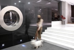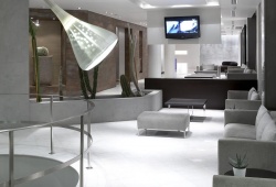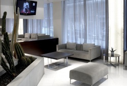 The well appointed rooms at Olympia hotel have marble bathrooms, earthy hues, and oak parquet flooring in addition to soundproofing. Philippe Starck-designed furniture and Artemide lighting are examples of tasteful detailing.