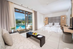 The spacious Astir Odysseus rooms, maisonettes, and suites provide with LCD satellite TVs and complimentary WiFi. A small safe and coffee/tea making facilities are further amenities. A private or shared pool is available to some. A large variety of sports are also available at the resort, including tennis courts, a 5x5 mini soccer pitch, a climbing wall, a gym, beach volley, bike rentals, and water polo. There are two playgrounds and a kids club with a variety of activities for the little ones.
