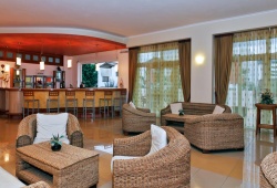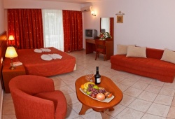 The cozy loungers of Gaia Kos Village surrounded by the reception area, invite visitors to unwind while enjoying satellite TV or Wi-Fi connectivity that is available throughout the hotel's public and private spaces. The structures containing the hotel restaurant and main bar, as well as the several lodging buildings and the two freshwater pools in Gaia Village, each with a dedicated children's section, are all accessible from the beautiful lawns and flagstone-laid walkways that extend beyond the main building. The pools are surrounded by comfy lounge chairs and umbrellas, and helpful staff members are always on hand to provide you beverages and snacks from the Pool Bar, respond to any inquiries you may have, offer guidance, or assist you in organizing your next outing or activity.