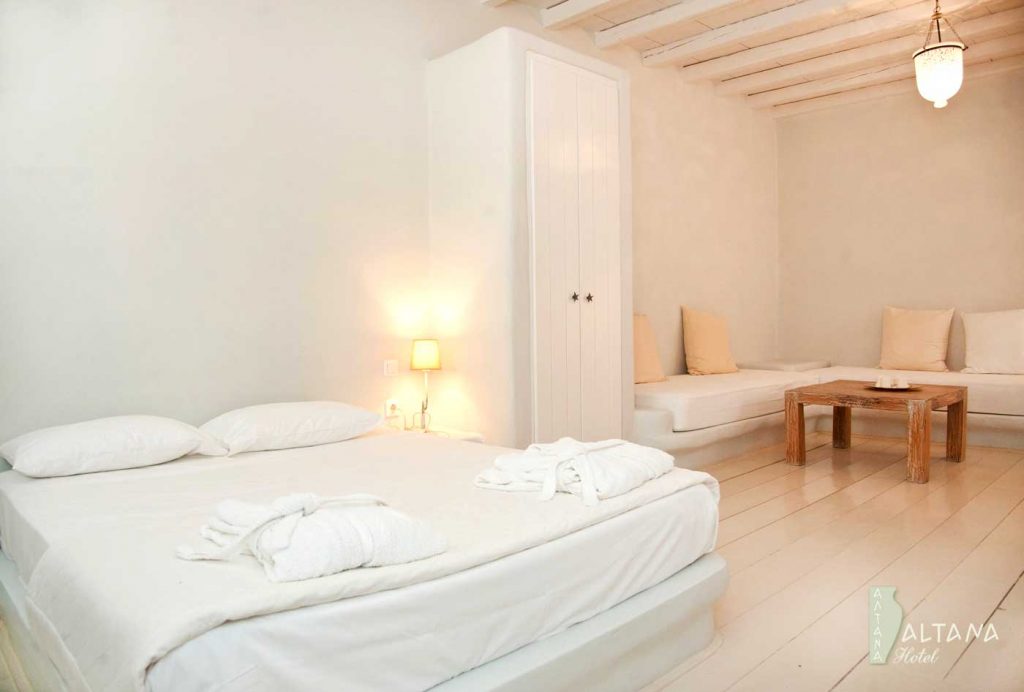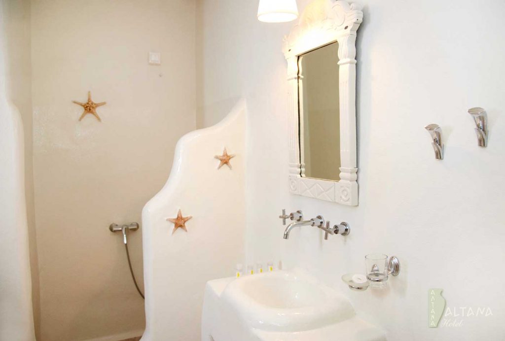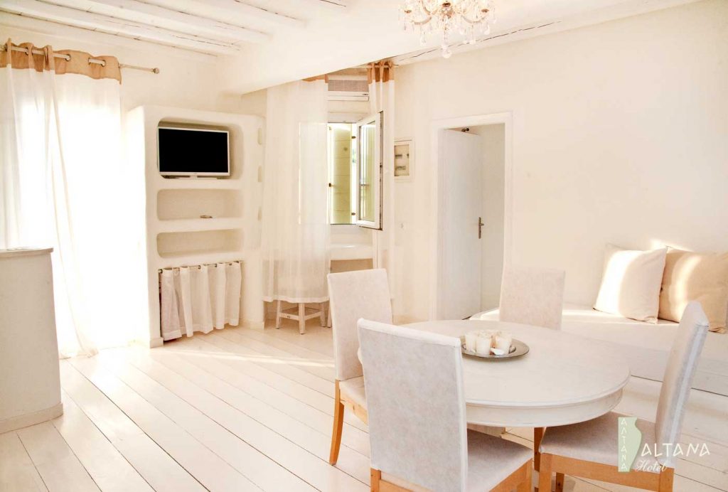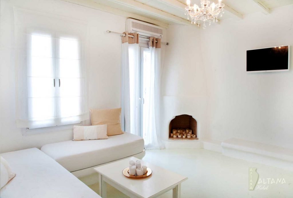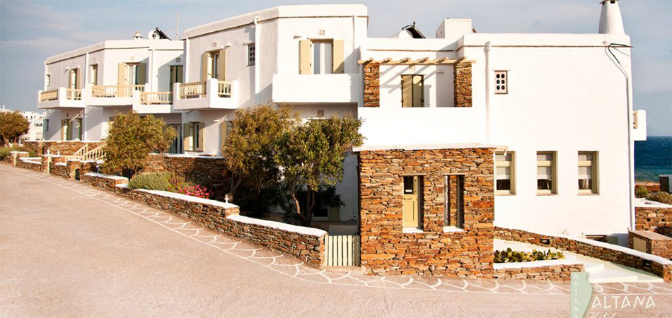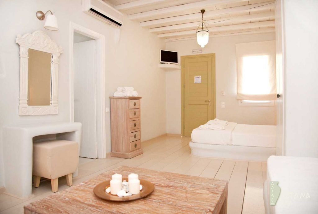 Atlana Boutique Hotel is situated in Tinos Town, built in the simple Cycladic style with origional Tinian features. Altana rooms, suites, and studios are all whitewashed and have classic built-in or iron beds, as well as private balconies. Each one has a mini fridge and flat-screen TV, and the most also include a kitchenette. In the bathroom, there's a hair dryer and complimentary makeup. The coffee and refreshing drinks are made at the bar. A classic breakfast buffet is given in the morning, complete with freshly cooked cakes, pies, and jams. Please be aware that breakfast is not an option between May and October. Among the hotel amenities are a modest fitness facility, a tiny swimming pool for relaxation, and flowing water from marble fountains. The distance to the Stavros beach is 200m, and the village of Kionia is 3 km distant. The distance to the well-known Virgin Mary church is 1 km away from Atlana Boutique Hotel. Discover the magic of Tinos today!