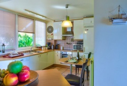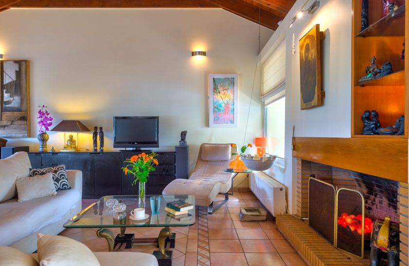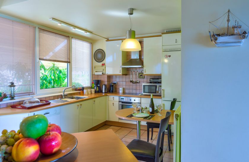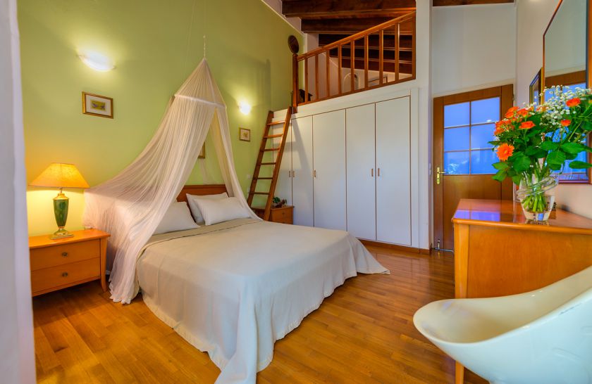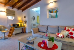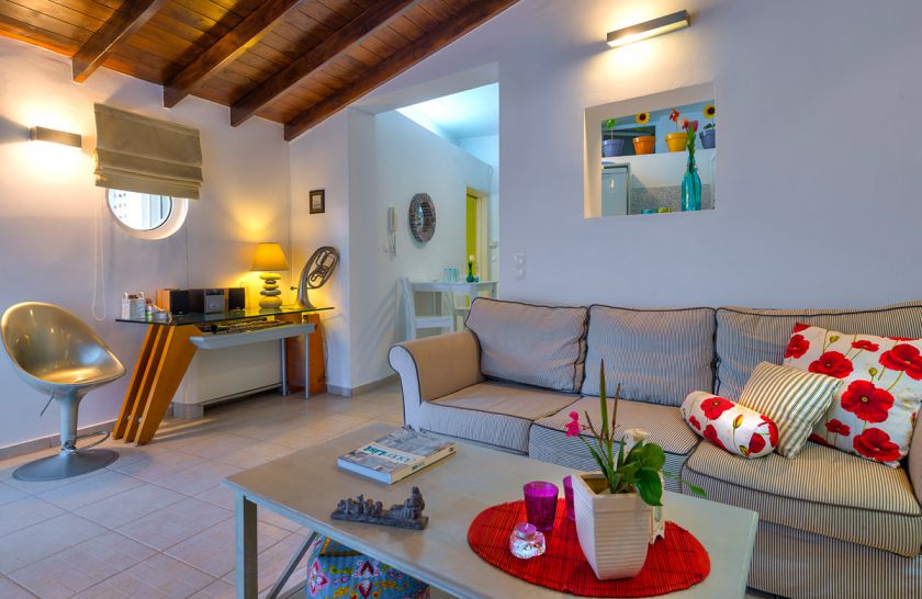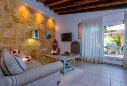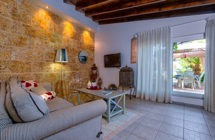 A computer with a Wi-Fi internet connection, a satellite TV, and other electronics are located in the large living area with the wooden ceiling and fireplace. and a hi-fi stereo. The villa can accommodate up to six guests. If you are looking for a private accommodation in Chania, Villa Zen in Agia Marina is the best place to be for a memorable vacation in Crete.