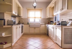 The three-story villa features three bedrooms with en suite bathrooms and double beds, each with a private balcony and a stunning view of the sea; two twin rooms with a shared bathroom; a playroom complete with a full-sized American pool table, bar, and TV area; a large living room that is open to the dining area; and a fully furnished kitchen for aspiring Greek chefs.