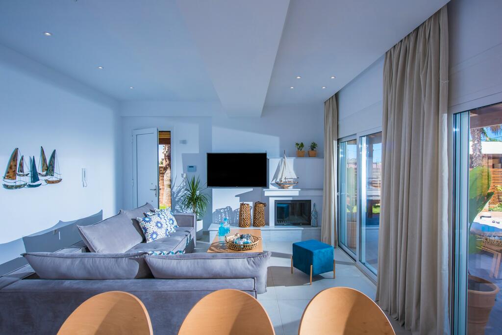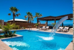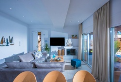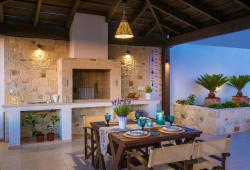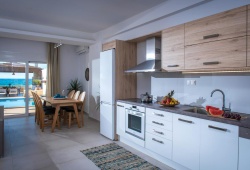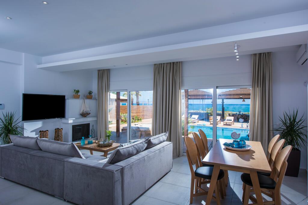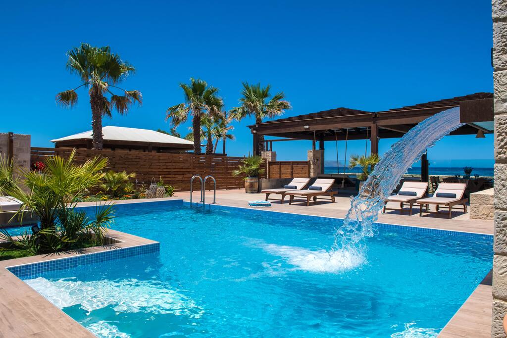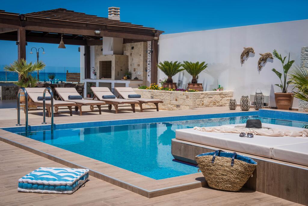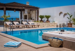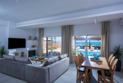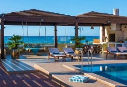 Mare Beach Villa is situated in Hersonissos, Crete Island, along the Analipsi Beach Road. The three-bedroom house is situated in front of the sea, with direct access to the beach, and features a private pool with salt water and an integrated jacuzzi. The recently constructed luxurious villa has three bedrooms, three bathrooms, garden, parking, a fully furnished kitchen, dining area, and living room with fireplace and satellite TV. Among other amenities of the villa are a washing machine, iron facilities, air condition, wifi in all areas and a parking space for your car. The villa can accommodate up to six guests. The large living areas in this magnificent villa are created with elegance, comfort, and solitude in mind, making it suitable for the most demanding guests.