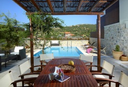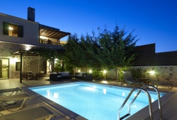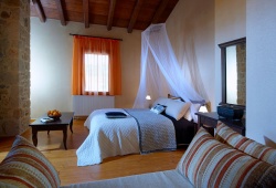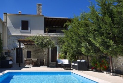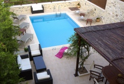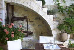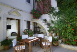 One of the finest accommodations in Crete, the villa "Agreielia" is housed in a restored traditional stone house of two floors (178,93 m2) in the village of Sgourokefali in Heraklion near Archanes. The ground level features a huge living room with an arch separating it from the dining room, a separate, fully equipped kitchen with a fireplace, a wide bedroom with a double bed (15 sq. m.) with an overlook of the eastern courtyard, and a large bathroom with a Jacuzzi. Ground floor living area with fireplace and classic furniture. Surrounded by two courtyards, the villa's bottom floor is a haven of flowers, colors, and scents where visitors can unwind and take in the scenery. An ancient stone stairway and well at the courtyard entry (west terrace) lend the area a certain ambience. There is a grilling area and a swimming pool for your enjoyment. The villa can accommodate from 2 to 6 guests.