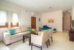 There are three private villas in the Real Dreams Villas complex. Every villa includes a 32 square meter private pool and is 70 square meters in size. Additionally, each one has an own parking spot. Each features a large bedroom with a double bed and a lovely living area with two large, comfortable couch beds that can sleep an additional two people. The kitchen is completely furnished and cozy. There is a large bathtub in the spacious bathroom. From the porch of each villa, there is an amazing view of the pool, the vast blue sky, the sea, and the mountains. The villas can accommodate up to four guests.