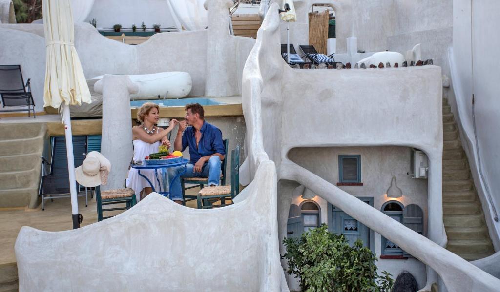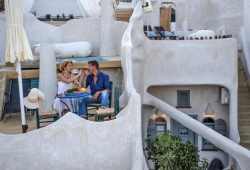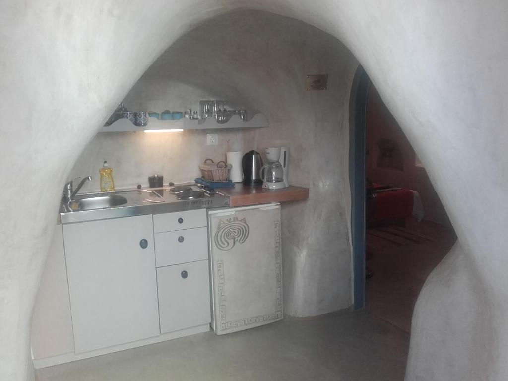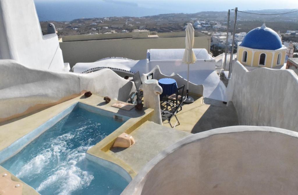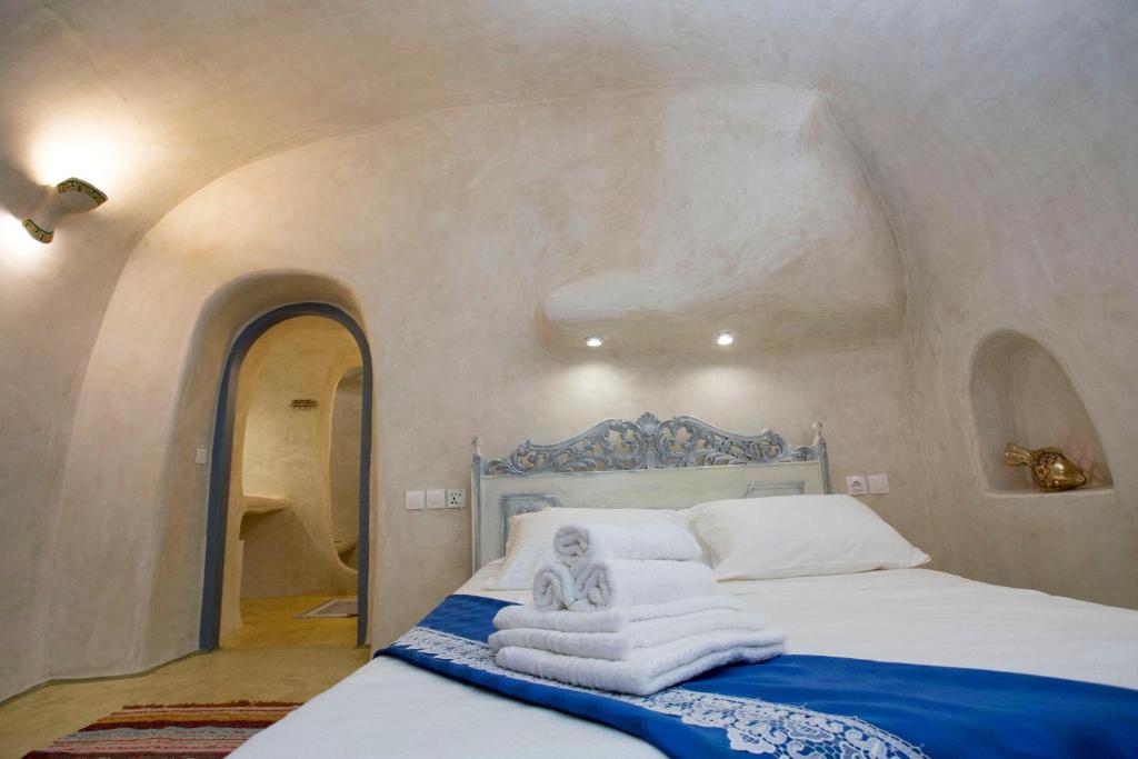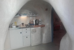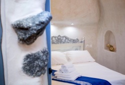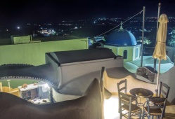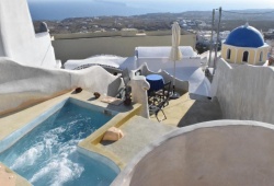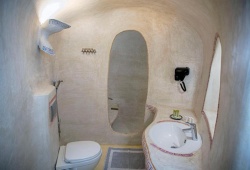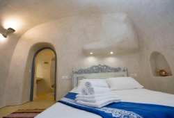 This cave in Fira, Santorini has a living room, kitchen, bathroom and two bedrooms with double beds. The entire space is around 62 square metres (630 square feet). Two extra people may fit on two couches. You ascend the stairs to the patio to find six-seater jetted tubs and open-air beds. Every wall, floor, and dome is coated with a handmade lavaplaster, which is an outdated method of pressing cement screed. All caves are airconditioned, equipped with a variety of television channels and wired internet with net channels for your entertainment. Also there is a mini bar in each cave for your convenience. The cave can accommodate up to 2-5 guests.