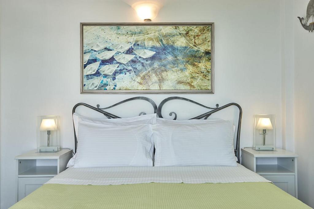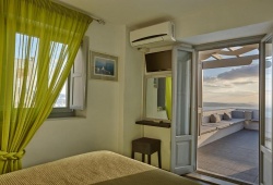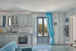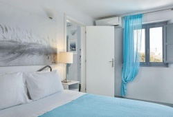 Exclusive accommodations are provided by two bedrooms with queen-size mattresses and eye-catching bright blue and green accents, a large living area with a sofa bed and a warm fireplace, a fully functional kitchen that can prepare even the most elaborate meals, and two unique bathrooms. Settle into a comfortable sunbed beside the Jacuzzi plunge pool and bask in the sun's rays while admiring the breathtaking view of the Aegean in such refined surroundings.