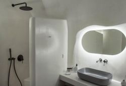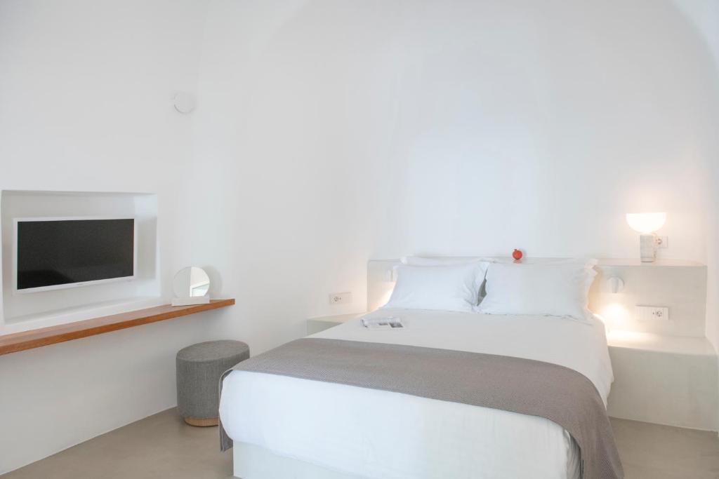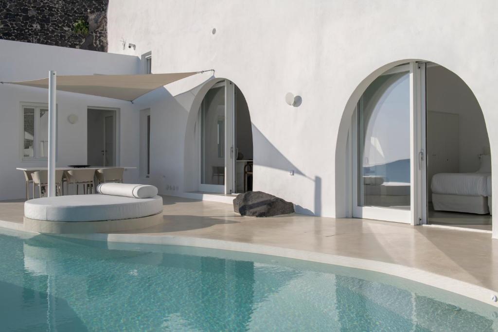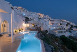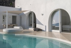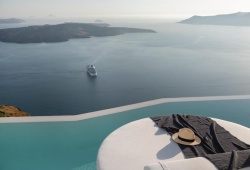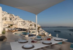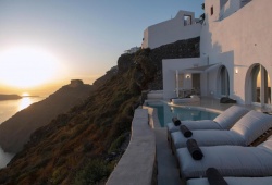 Aegean Sea and volcanic views abound at Villa Dio, which is perched on Santorini's highest point in Firostefani, perched atop the cliff of the renowned Caldera. With three queen-size double bedrooms and ensuite bathrooms, the villa can accommodate up to six (6) people (an additional person can sleep on a roll-away bed upon request for an additional fee). King beds, private bathrooms, TVs, and air conditioning are features shared by all three of the villa's bedrooms. The well-appointed kitchen, perfect for cooking special meals, and the cosy living area of the villa await you. A private heated infinity edge pool with six sun loungers, an opulent living room, and a dining area make up the villa's outside patio, where visitors can unwind and take in Santorini's spectacular sunsets, the captivating volcano, and the amazing sea view. If you are not cooking at Villa Dio, Firostefani's little center square has a good range of restaurants for a bite to eat, along with excellent wine and beverage selections and delicious food. The highest point on the island, Firostefani, is positioned atop a cliff overlooking Santorini's caldera islands. If you are searching for a private accommodation in Firostefani with the Santorini views, Villa Dio is the ideal option.