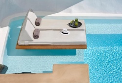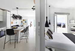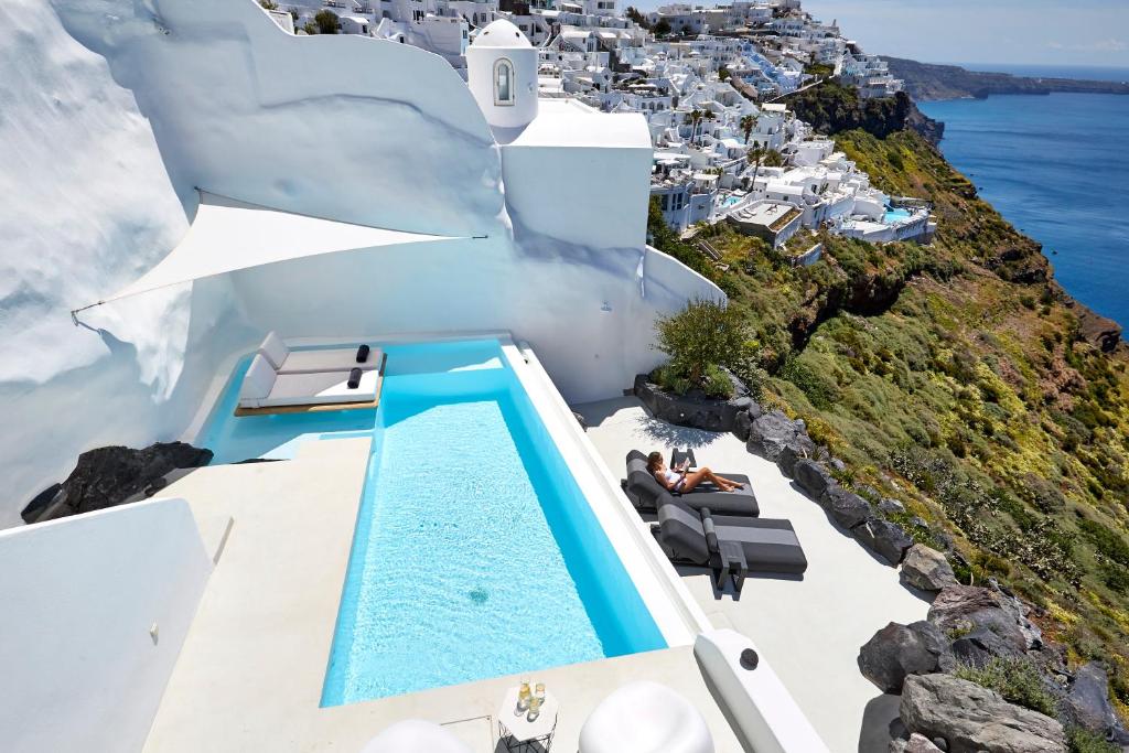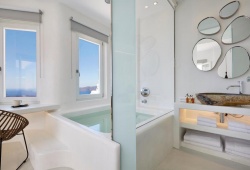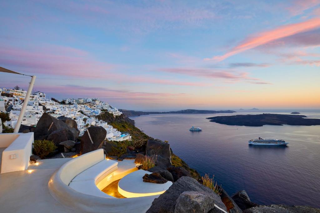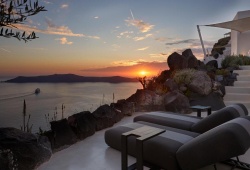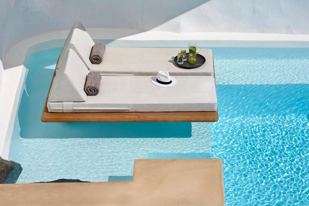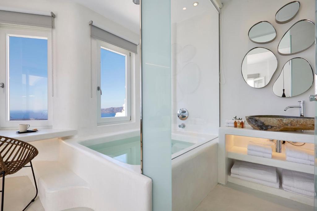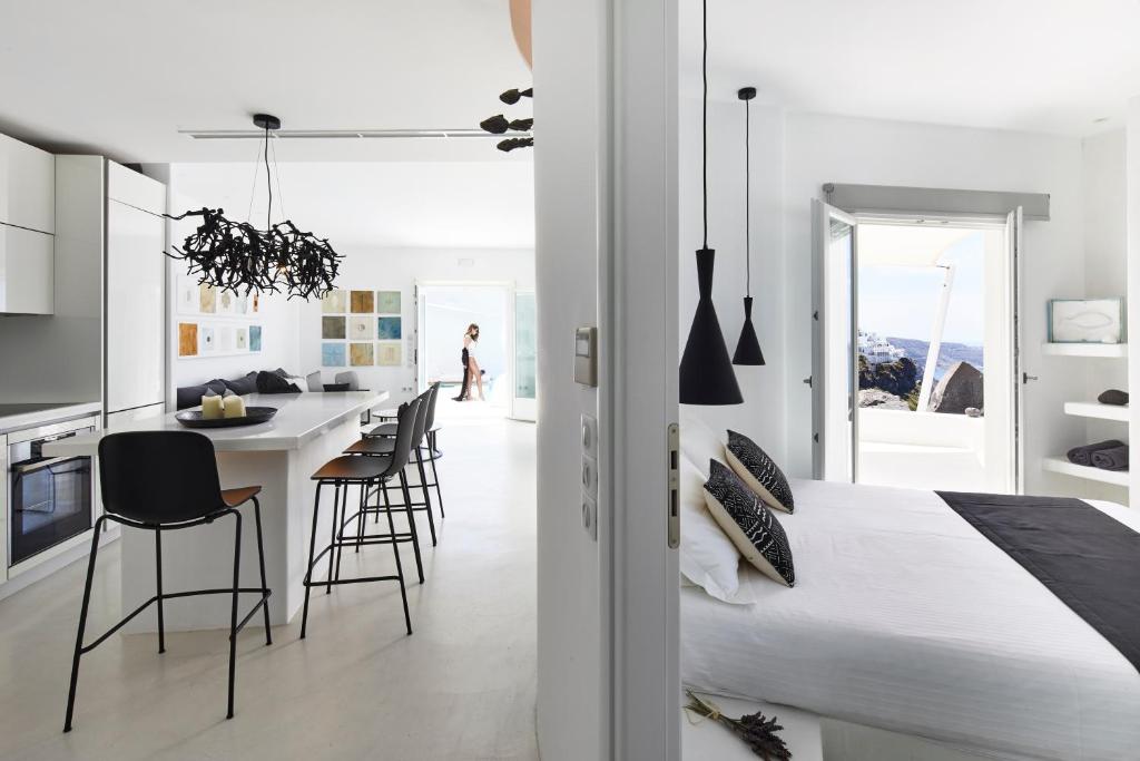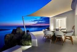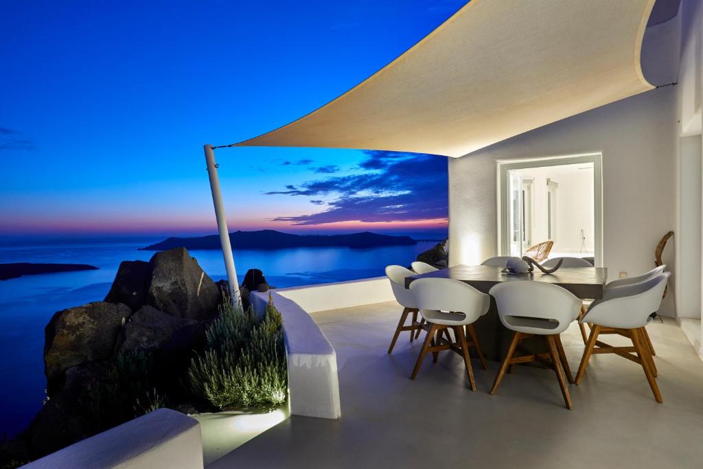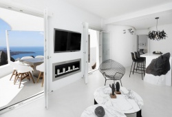 The villa Etheras accommodates up to four people and features essential aesthetic elements including a large living area, two bedrooms with en suite bathrooms, and a fully functional kitchen. Villa Etheras looms large from the rocks. An extension of the rock, Villa Etheras' outside space has a heated infinity edge pool with unending views of the Caldera, the Aegean Sea, and the sunset over Santorini.