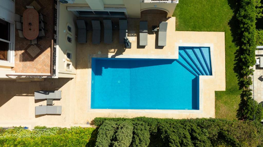 Villa Domus Riviera is a four-story, five-bedroom home with 180 Saronic golf views, a large pool, and even a private gym. It is situated near the famous Vouliagmeni and Glyfada areas, which are among the most popular spots on the Athens Riviera. There are five bedrooms, two living rooms, a flat-screen TV, a kitchen with an oven and a microwave, seven bathrooms with a walk-in shower, and a large villa with a terrace and views of the sea. The apartment features parquet flooring, a fireplace, and soundproofing. There is an outdoor dining area on the property. The distance to Athens Airport from Villa Domus Riviera is 18 kilometers.