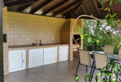 There are two distinct villas on the site, each with an own pool. While the Villa with Private Pool may accommodate up to 4 people, the Five-Bedroom Villa with Private Pool can accommodate up to 12 guests. It is possible to reserve two villas at once or individually. The large villa has a DVD player, a flat-screen TV with satellite programming, and a fireplace. It has a dining area and fully equipped kitchen, as well as a bathroom with a hair dryer and bathtub. Standard features include a washing machine and air conditioning. The house has a gorgeous exterior. 4000 square meters of grass, palm, pine, and olive trees, as well as a huge, fully functional barbecue kiosk.