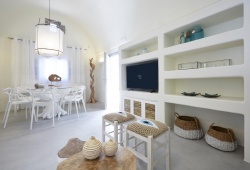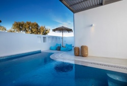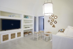 Eolia Kamari Villa in Santorini is ideally situated a mere stone’s throw from the town centre, the local beach, a world-famous cinema, and easy access to public transport. Consisting of two impressive villas, the Superior and Senior, Eolia Luxury Villas offer you a unique opportunity to relax, unwind, and take time just for you. It has 2 bedrooms, a master bedroom, a living room with a double sofa, fully-equipped kitchen with built-in kitchen appliances and a dining room. Outdoors, you will find a luxurious private swimming pool with whirlpool and the sitting area. Eolia Kamari Villa is suitable for couples, groups of friends, or just you and your family. The villa can accommodate up to six guests. If you are looking for seclusion and leisure, Eolia Kamari Villa in Santorini is the ideal option.