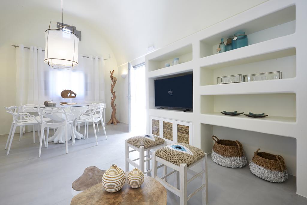 Built to blend in naturally with its surroundings, Eolia Kamari Villa is situated on the slopes of Exo Gonia in Santorini, a small picturesque settlement just below Pirgos Village, whose beauty and traditional architecture remain untouched by time. There’s no doubt that the minimalistic yet sophisticated design of Eolia Villas, along with their truly hospitable atmosphere, will immediately captivate you and win a place in your heart. Hospitality is what the people of Santorini are best known for.
