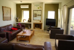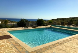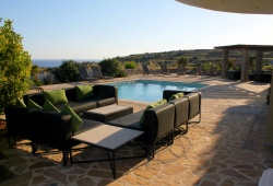 Lagada Villa has 5 bedrooms and 3 separate balconies + roof-top terrace fully equipped. The dining room on the ground level can accommodate ten guests and has an open fireplace and a huge lounge area with a leather three-piece suite and a 42-inch TV. Along with the kitchen, the ground floor also houses a family bathroom, a bedroom, and an en suite bathroom. Upper floor are the other four bedrooms and bathrooms. Outdoors, you will see the swimming pool with BBQ facilities, sunbeds, and umbrellas.