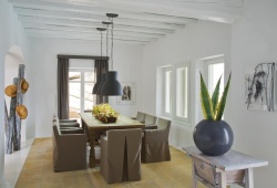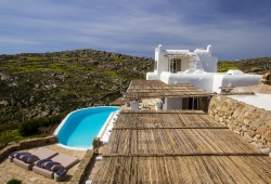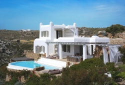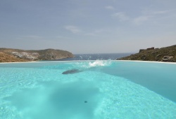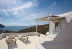 Situated on the southeast side of Mykonos Island, Villa Artisti stands elegantly on top of the two famous beaches, Agrari and Elia. Comfort, quality, privacy, and great views blend to offer guests a unique experience. Villa Artisti consists of the main house, the guest pool house, and the secret suite. The main house is built on three different levels. The ground level features the living and dining rooms, with direct access to the pool and private verandas with gorgeous views of the Aegean Sea. This level has a fully equipped kitchen next to the dining area with seating for 12. The villa accommodates up to 12 guests.