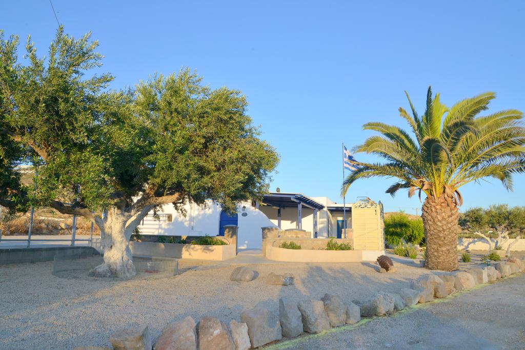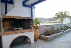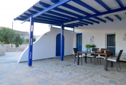 On Mylos Island, Traditional Villa Relax is situated in a prime location next to the town of Zefiria, in the middle of the island, away from the bustle and tourist traffic, and with easy access to all the beaches. Three and a half kilometers from the Papikinou beach, four and a half kilometers from Sarakiniko, three kilometers from the airport, and four and a half kilometers from the port of Adamas are its distances. Constructed in the classic Cycladic style, the villa boasts a spacious garden, a dining space on the veranda, barbeque amenities, and an amazing mountain view.