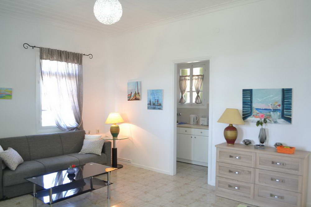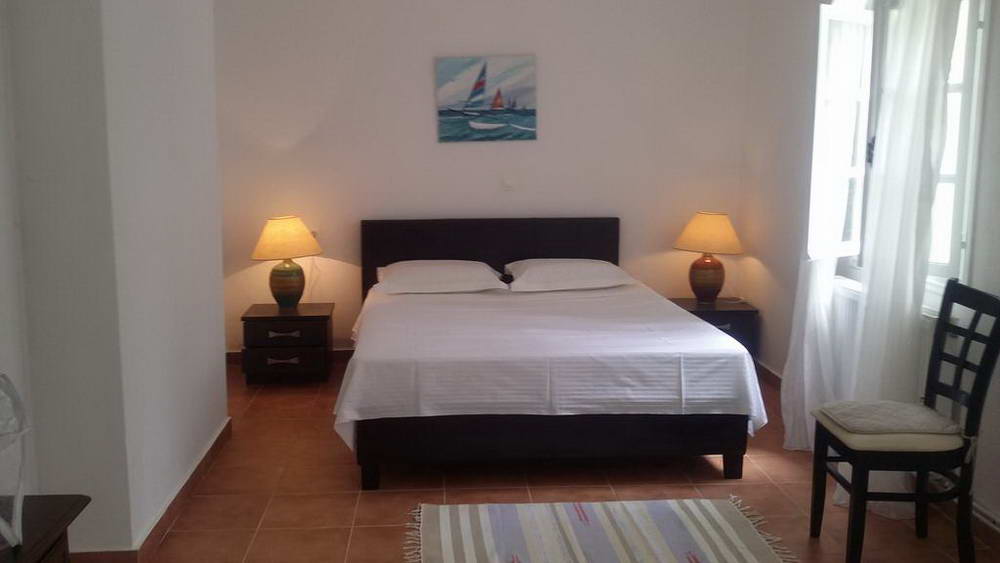 There is a double bedroom, a comfortable living room-dining room, a kitchen, a bathroom, and a WC. It features a terrace overlooking the lush countryside, and in the distance appears Panormos Beach. In the lounge, there are two comfy sofas near the fireplace and a dining table. The kitchen has a stove, microwave, toaster, kettle, and all the utensils needed to prepare a meal. On the ground floor, there is a studio for two people with a kitchen and bathroom with an independent entrance.
