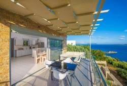 Dream View Villas is a collection of luxurious villas perched above Sivota Lefkada's gorgeous bay, offering an incredible view. Its cozy rooms and modern, minimalist style will astound you, and its subtle elegance will leave an impression. It can accommodate up to six people and features a jacuzzi, sauna, color therapy, and aromatherapy cabin in addition to two bedrooms with en suite bathrooms. The bedrooms of the 102-square-meter property are furnished in serene blue and white tones. Doors lead to a covered patio furnished with lounge chairs and a gas grill. Traditional Greek artwork and handcrafted wooden furniture typical of the Ionian Islands enhance the modern interior design. Modern appliances complete the villa's equipment list, and the bathrooms' ergonomic fixtures An expansive living area with a satellite TV opens to a seaview terrace outside.