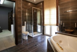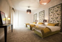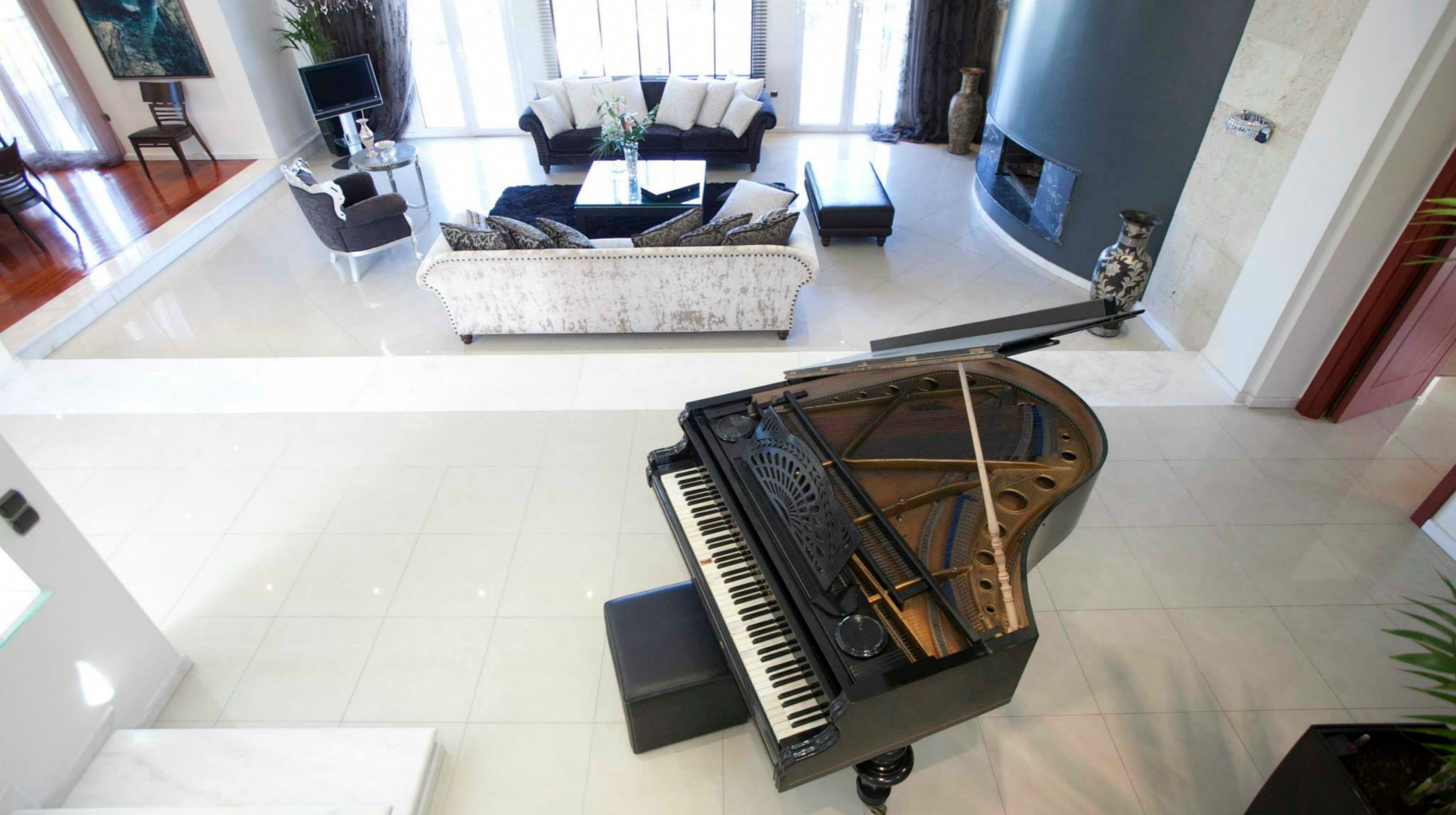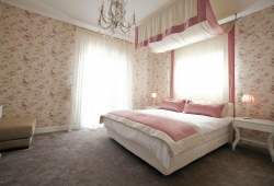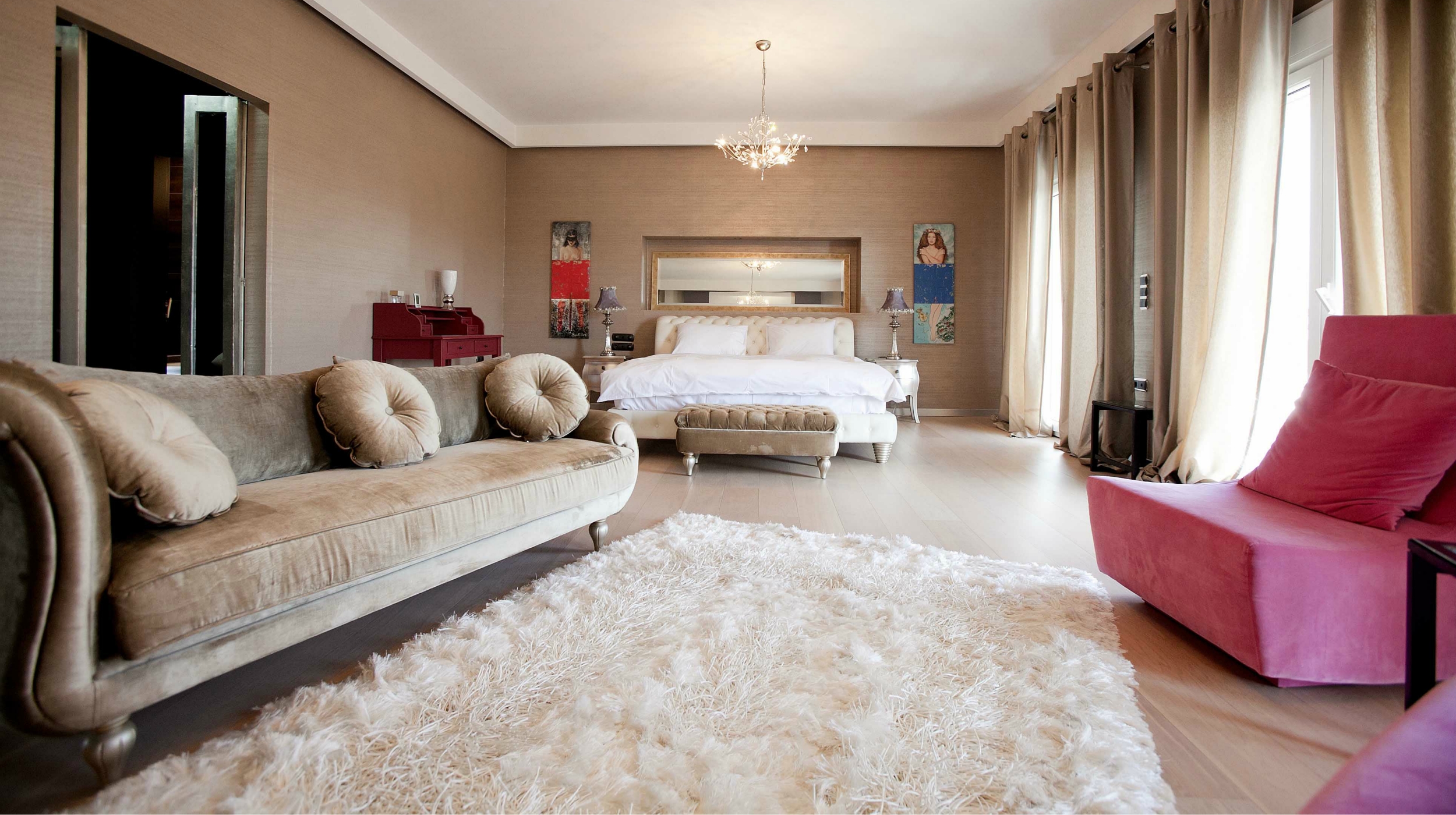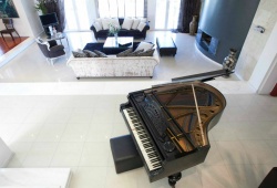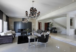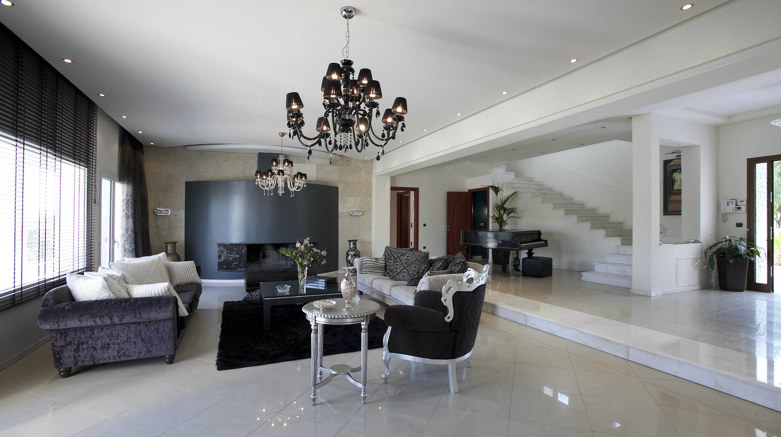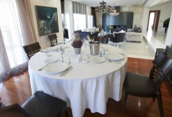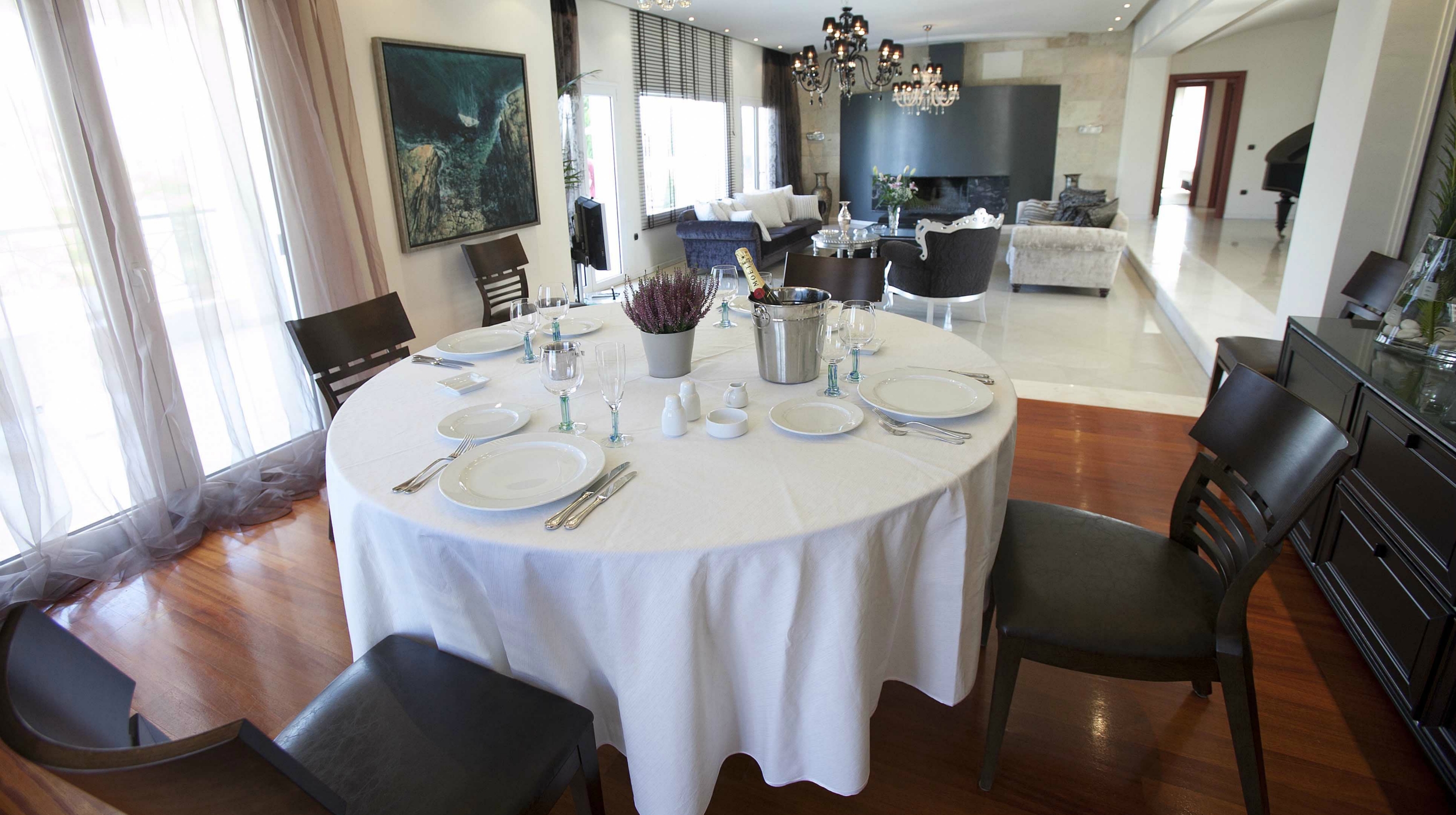 There are four distinct, completely air-conditioned guestrooms at the Villa Elena in the Perea region of Thessaloniki, each with three king-size double beds, three single beds, and three spacious couch beds. A fully furnished kitchen, a dining space, and four opulent bathrooms—three of which are en suite—are also provided. There's a piano in the large, tasteful living area beside the fireplace.