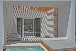 Families, groups of friends, and couples that value the peace and quiet of island life and want to unwind during their vacation will find the newly refurbished Tinos Blend Suites to be perfect. Four visitors may enjoy the opulent indoor and outdoor areas, including the three elegant infinity pools with spa positions, the comfy patios and decks, and the roomy, unwinding inside living spaces, in each distinct suite, which is meant to provide a smooth, stress-free holiday for them. The Tinos Blends Suites are a tribute to carefree, easygoing living. There is room for up to four people in the villa.