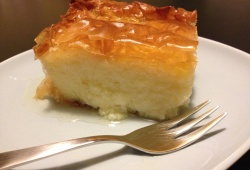 Galaktoboureko is a traditional Greek dessert that is made with layers of phyllo pastry and a creamy custard filling. The custard is made with semolina, milk, eggs, and sugar, and is flavored with vanilla and lemon zest. The dessert is then baked until the phyllo pastry is crispy and golden brown.