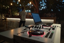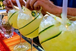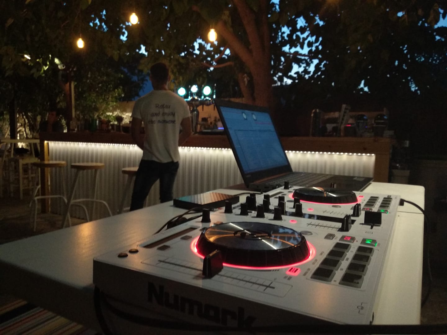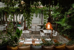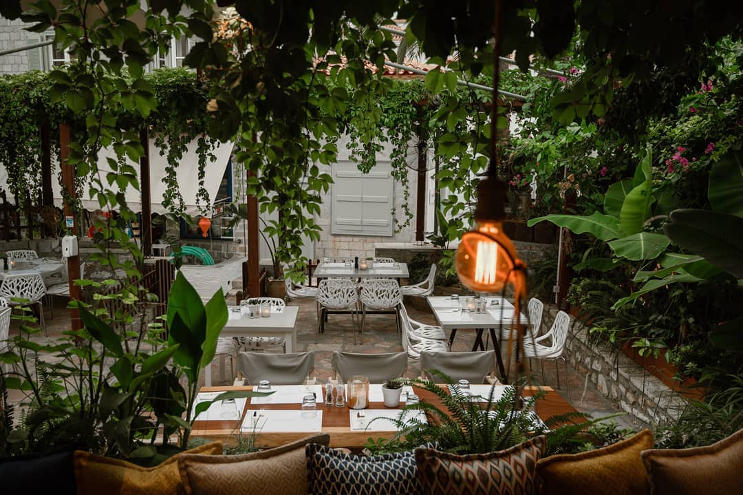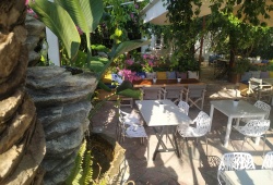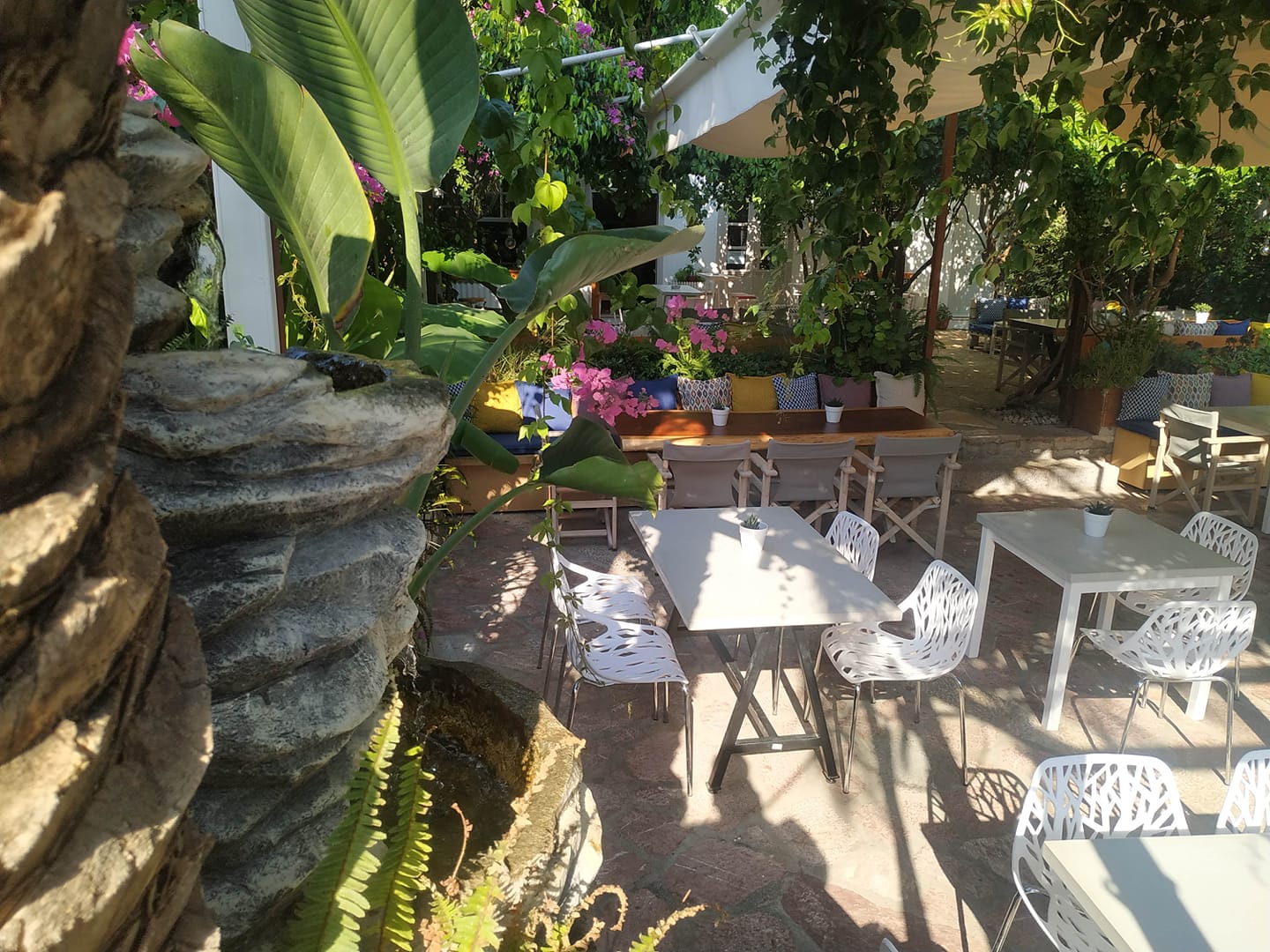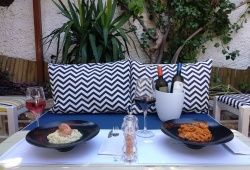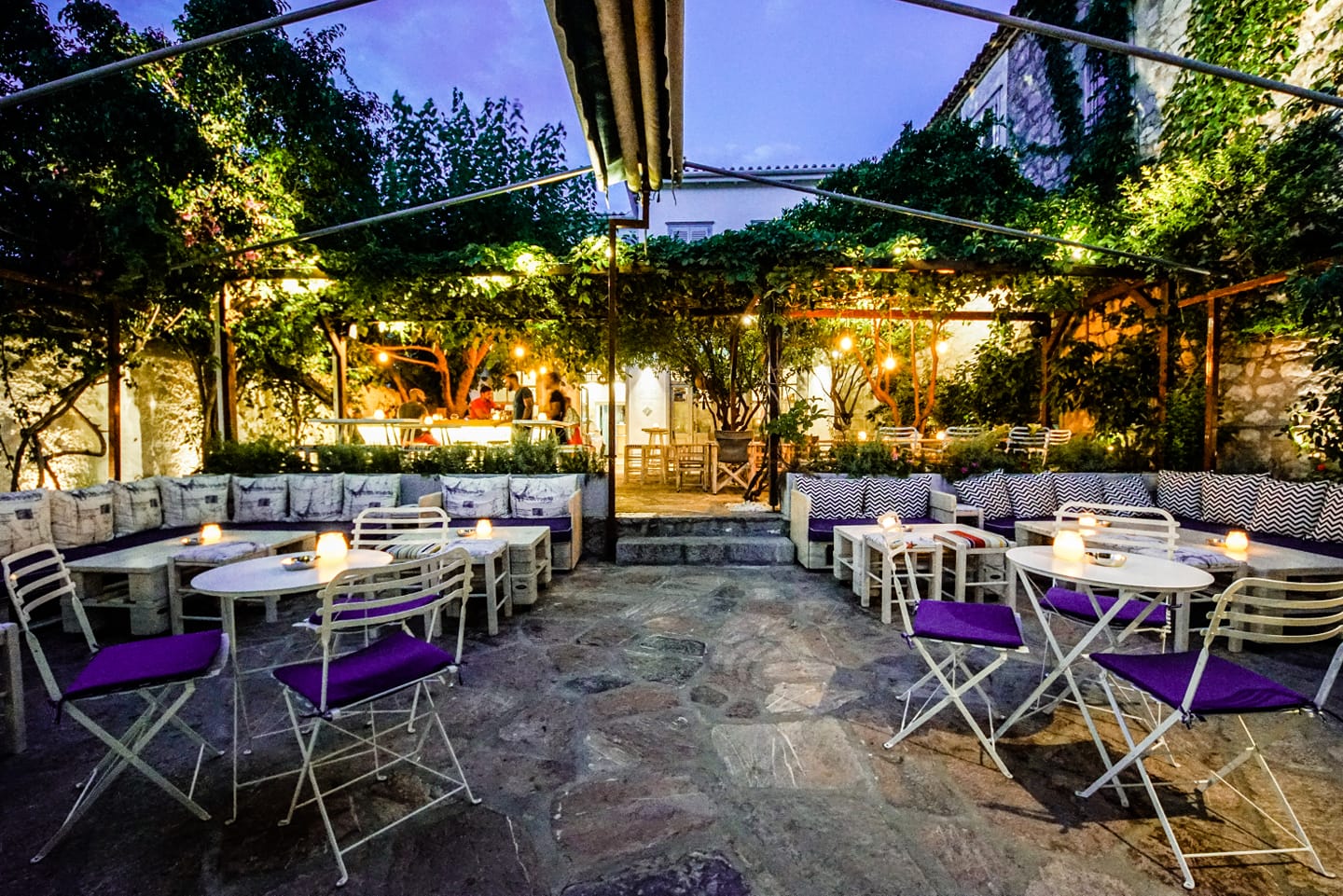 Plakostroto in Hydra Town for all-day dining and cocktails on Hydra Island, Greece. You'll also get excellent coffee with a good breakfast to start your day! Located off the port on Miaoulia Street, the Plakostroto entrance steps open to a large courtyard dining area and bar with comfortable seating in the sun or under shady vines. The Plakostroto Bar in Hydra has a superb, well-selected cuisine for breakfast or dinner, wonderful cocktails, background music that isn't overbearing, and a warm, welcoming, professional setting with a contemporary, cheerful vibe.