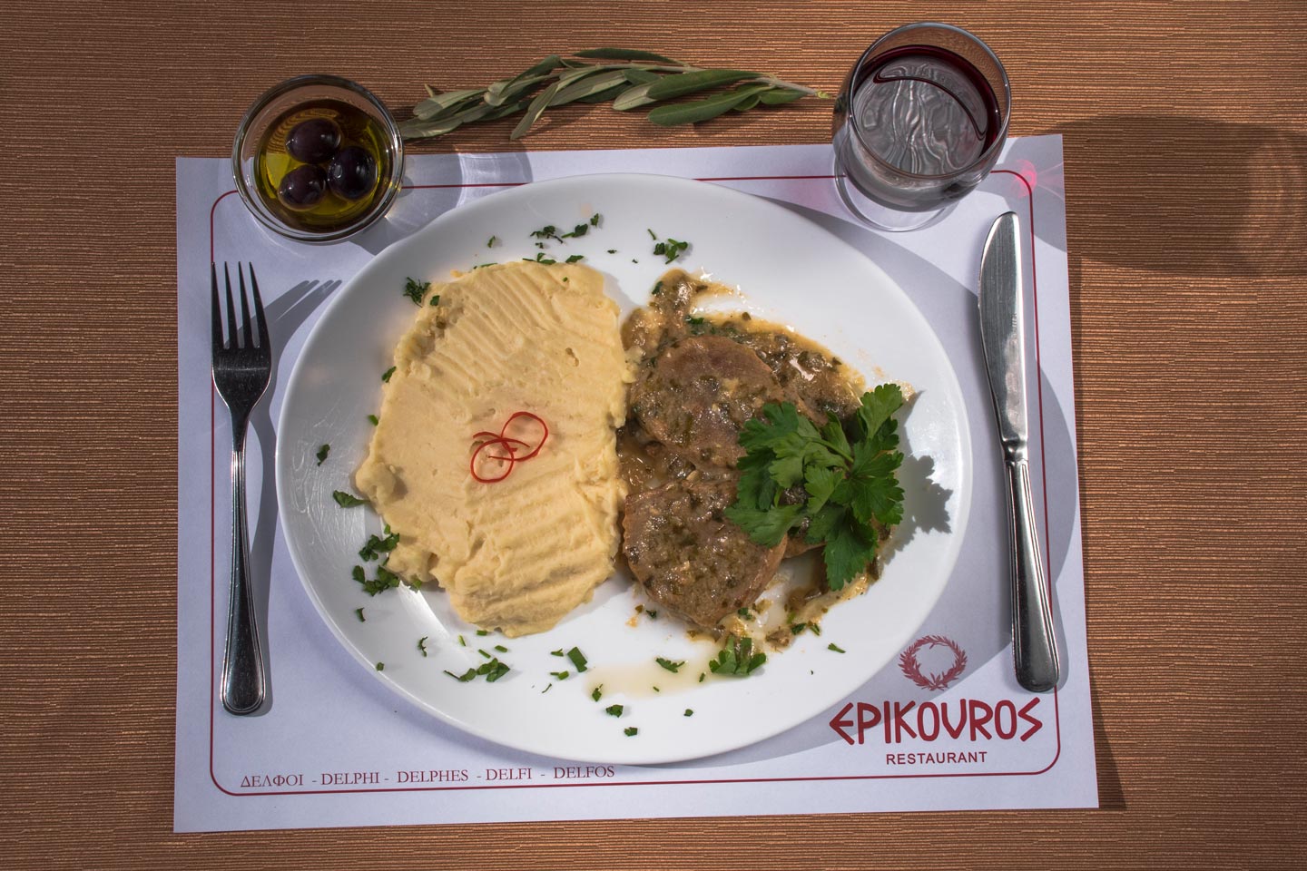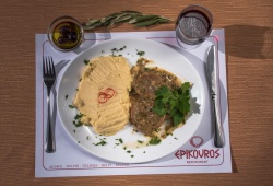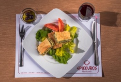 Epikouros Restaurant is located on the central street in Delphi town, the “Navel of the Earth.” Combine sightseeing in Delphi and gastronomy. Savor lunch or dinner while you enjoy a magical view of the Gorge of Delphi, the olive groves of the Pleistos Valley & the Corinthian Gulf. The a la carte menu of Epikouros Restaurant in Delphi offers fine Greek cuisine, with a wide variety of dishes, all cooked to perfection. The ambiance, a harmony of stone and wood, adds to your dining pleasure.