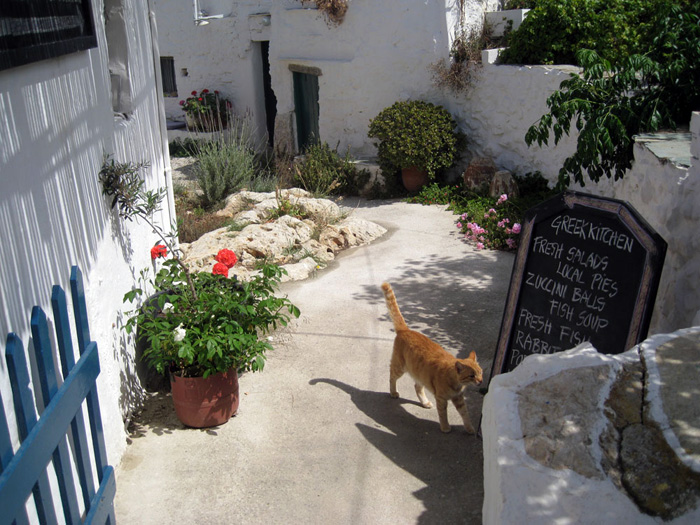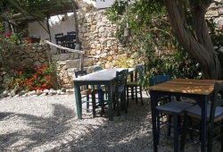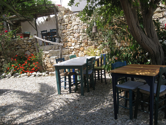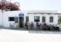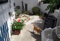 On the first square of the Folegandros Hora—where you get off the bus—lies the family tavern, "Pounta." For 20 years it has been serving quality Greek food in beautiful surroundings. You can enjoy your breakfast, your lunch, or your dinner in the quiet garden, under the trees and amongst the flowers, or you can sit in front of the restaurant, following the activity on the square.