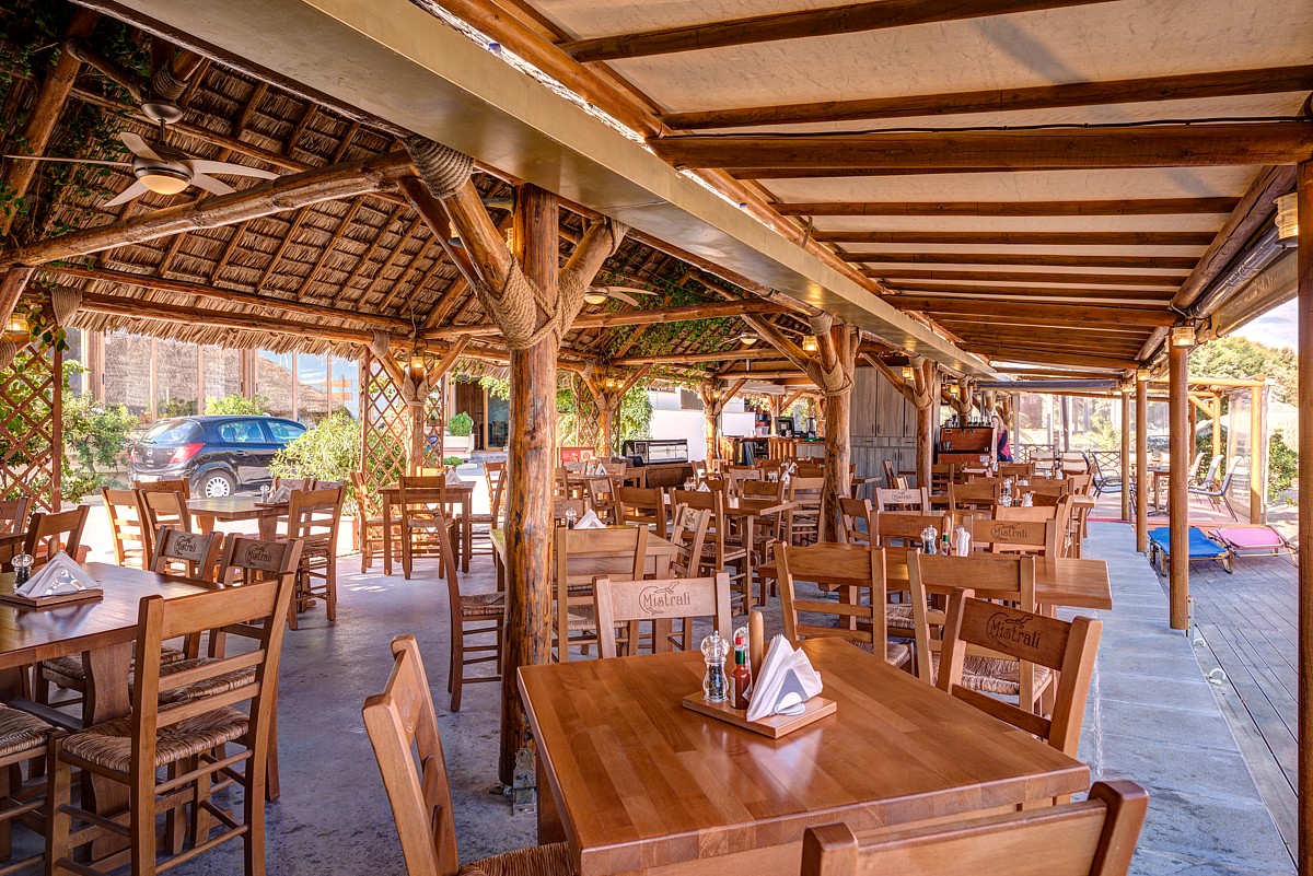 Mistrali Taverna & Beach Bar is situated in Kalyves right across from the Mistrali Hotel, and specifically, it is right on the beach. The menu is inspired by the flavours of Mediterranean and Cretan cuisine. Seafood provided by local fishermen, meat and poultry, and traditional home-style entrees are all cooked using high-quality ingredients and the family’s locally produced olive oil from olive trees in the Chania region. In Mistrali, there is also a kid’s menu available, offering a variety of options cooked and sized for children. The taverna also offers a great selection of local wines and beers, and the bar can make just about any drink or cocktail you desire.