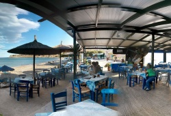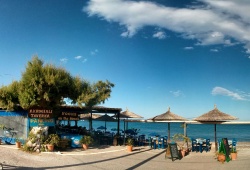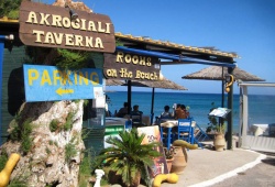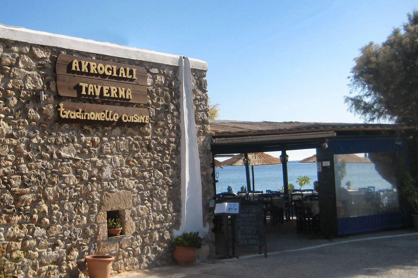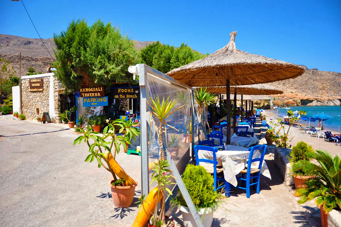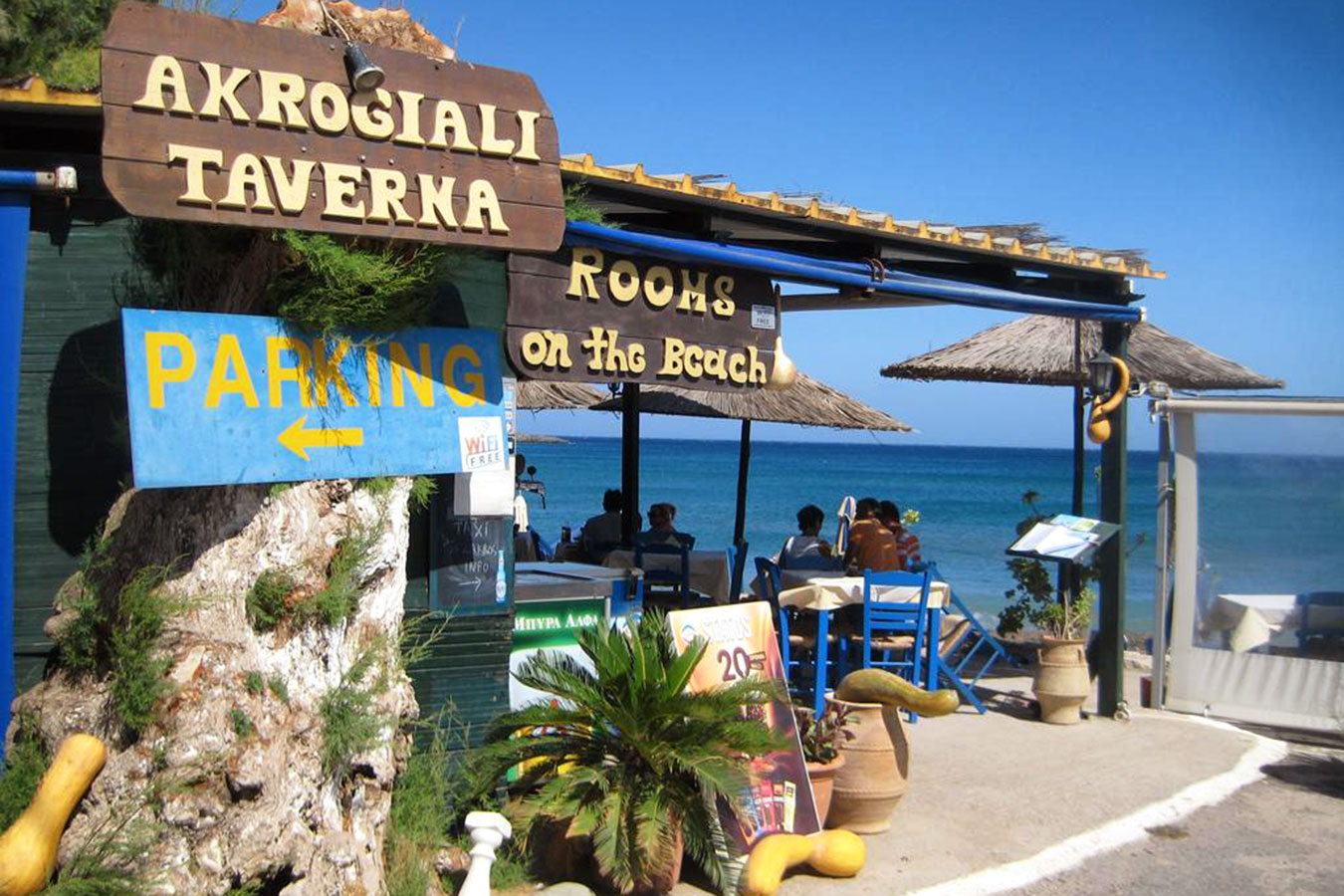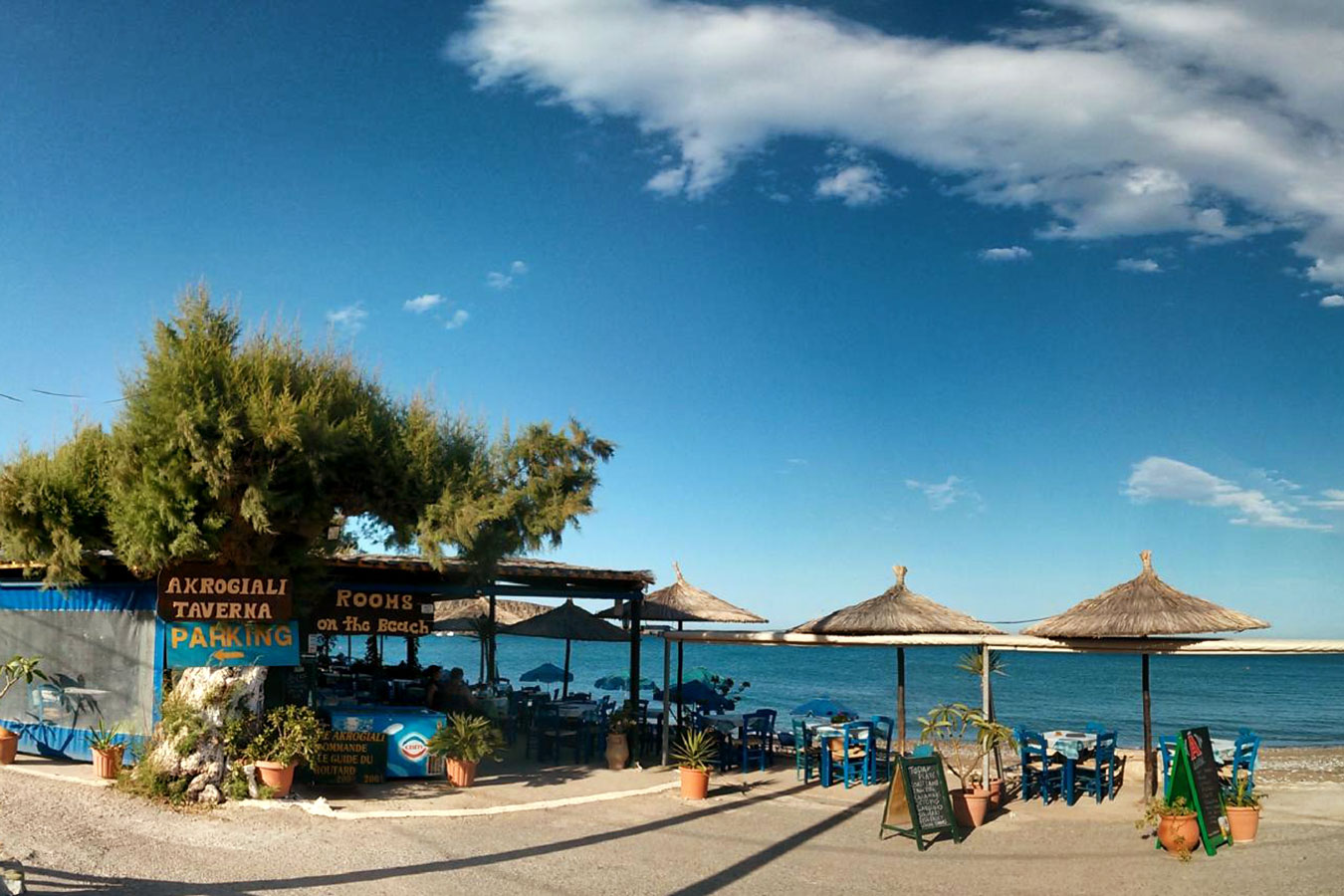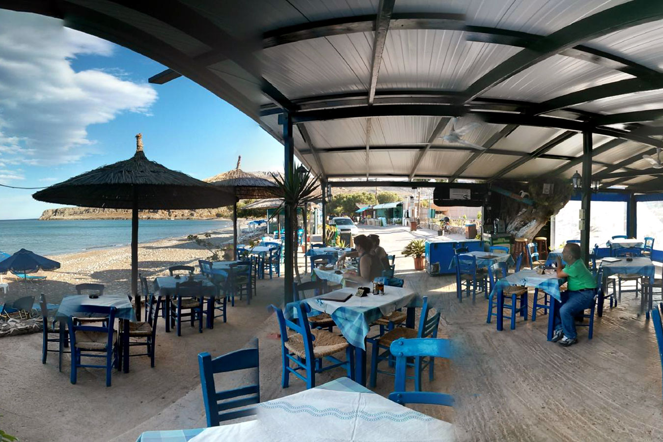 Akrogiali—this name is indeed right for this tavern that stands only 5 meters from the beach. It is the oldest tavern in the region of Kato Zakros, a building that was built in 1898 and had the name Maria. They give big importance to quality in Cretan gastronomy and to all the materials that they use, taking into consideration always the local production and chastity. The oil is from the olive trees of Nikos, and the vegetables are from the farmers of the region, as well as the meat from the cattle breeders of the region. As for the fresh fish, it is daily provided by the captains Manolis, Giorgos, and Kostas, who give it to us straight from their caiques. Here, next to the sea, you will find us ready to serve you from early in the morning to enjoy your breakfast or coffee, and as the day rolls on, we serve you refreshments or fresh juice, and for the older people, a cold beer or ouzo with chosen mezedes.