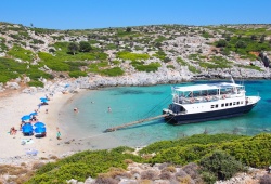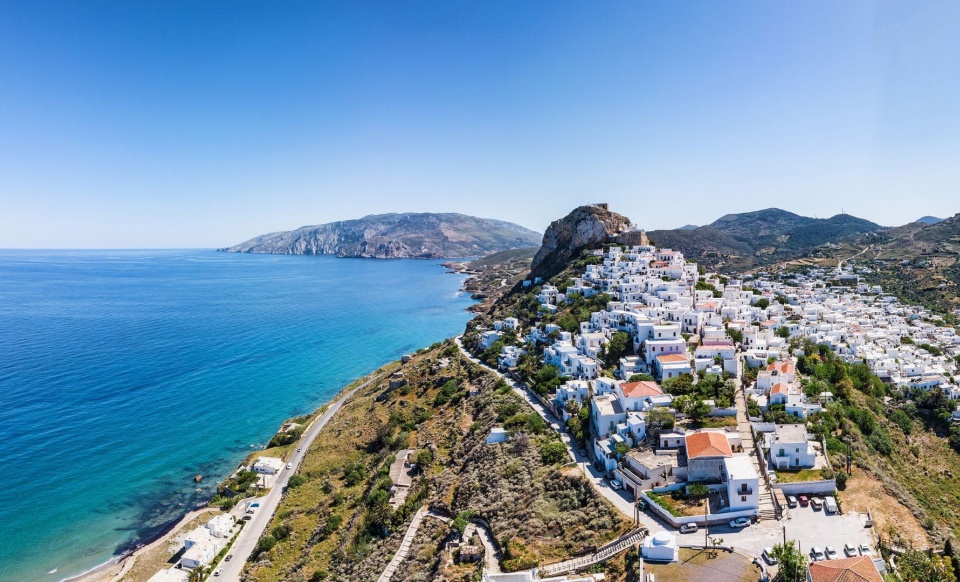 To get to Skyros, take a ferry from the port of Kimi on Evia Island. During the summer, there is also a local ferry link to Skopelos and Alonissos. The island's accommodations consist mainly of traditional rooms and apartments with few amenities, occasionally featuring a pool. Most hotels are located near the two main beaches, Molos and Magazia, with some studios and accommodations available in Skyros Town, Linaria, Atsitsa, and Pefkos.