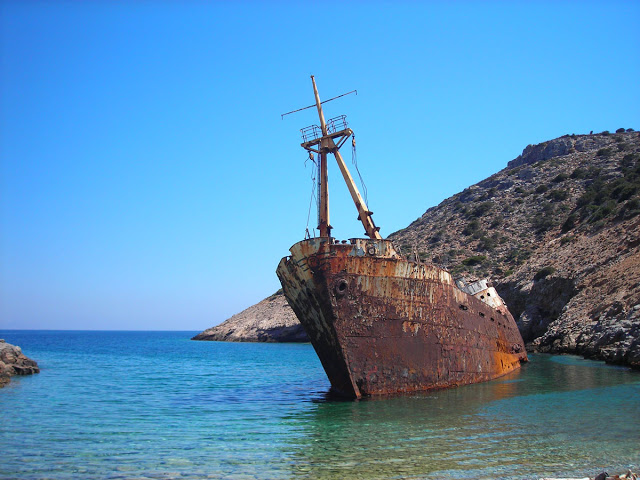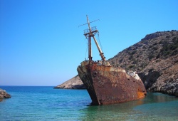 Amogos Sights & Monuments - The Olympia Shipwreck in Amorgos, Greece, formerly known as the 'Inland', is a popular tourist attraction situated close to the town of Kalotaritissa. This shipwreck is believed to have been caused by pirates and was famously featured in the movie "The Big Blue". Discover and explore the fascinating history of the Olympia Shipwreck in Amorgos, Greece.