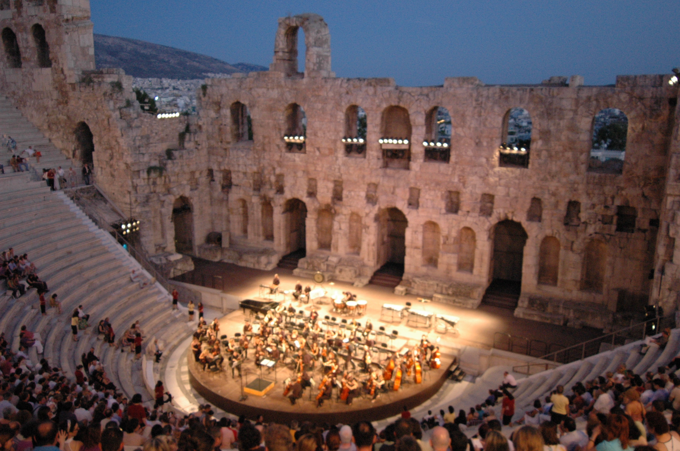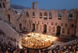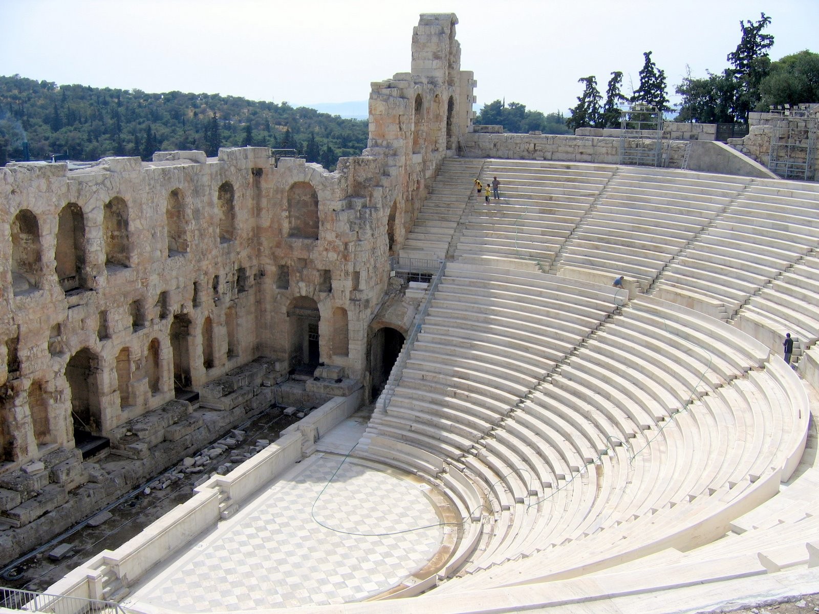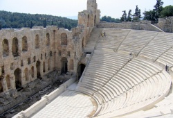 Athens Sights & Monuments - The Odeon of Herodes Atticus in Athens, Greece is the best-preserved monument of the Acropolis. Originally built in 161, this stunning stone theatre continues to be widely used for various activities. Though the cedar of Lebanon roof has not survived, the theatre's white marble bench, stone wall, and scene remain perfectly preserved. With its exceptional acoustics, the theatre has been renowned since ancient times and still surprises visitors to this day. Attend the Athens Art Festival, musical concerts, and classical tragedies under the night sky from May to early October and experience the Herodeion Theatre's marvelous acoustics. Located on Dionysiou Areopagitou Pedestrian Street, directly under the Acropolis, the theatre is easily accessible and always worth a visit.