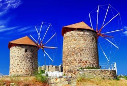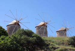 Patmos Sights - Overlooking the sea on a hill to the east of the Holy Monastery of Patmos, lie the picturesque windmills of Chora. The three windmills in the adjoining neighborhood of Mili lend it its name. These windmills have been recognized as an additional jewel of the island since their restoration in 2010, which was acknowledged by Europa Nostra. Dating back to 1588, two of the windmills, along with the third one that was constructed in 1863, were abandoned in the late 1950s as industrial milling took over traditional production. These windmills are a must-visit for anyone exploring Patmos and offer a unique glimpse into the island's history. Don't miss the chance to witness the stunning windmills in Patmos, Greece.