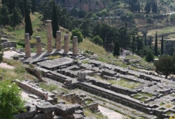 Delphi Sights & Monuments - The Apollo Temple in Delphi, Greece, is a significant ancient religious sanctuary dedicated to the god Apollo. This temple, situated on the slopes of Mount Parnassos, housed the renowned Oracle of Apollo. The Oracle provided enigmatic predictions and counsel to individual people and city-states. Delphi also hosted the Panhellenic Pythian Games. As one of Greece's most notable monuments, Delphi is recognized by UNESCO as a World Heritage Site. Its roots date back to the late Bronze Age (1500-1100 BC), when it was first inhabited during the Mycenaean period. Delphi gained religious importance around 800 BC, and its original name, Pytho, was inspired by the snake that Apollo supposedly slayed there. In Greek mythology, Delphi was regarded as the center of the world. According to the myth, Zeus dispatched two eagles, one to the east and another to the west, and Delphi was where they met after flying around the globe. The omphalos (or navel), a dome-shaped stone outside Apollo's temple, symbolized this fact and represented the site where Apollo defeated the Python. Lastly, contrary to popular belief, the Oracle did not predict disasters; it provided guidance and answers to inquiries posed by its visitors.