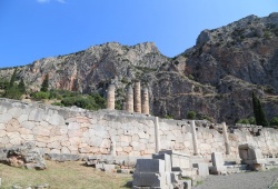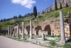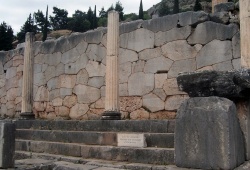 Delphi Sights & Monuments - The Athenian Stoa in Delphi, Greece is situated in the Sanctuary of Apollo, towards the southern end of the Apollo Temple platform. Its north wall is formed by the southern, polygonal wall of the platform. Originally built by Athenians in dedication to their victory in the Persian War, the stoa's top step features an archaic inscription commemorating the trophies acquired from the Persians. Plan a visit to the Athenian Stoa in Delphi, Greece to explore its intriguing history and impressive architecture.