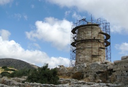 Naxos Sights & Monuments - Chimaros Tower in Naxos, Greece is an ancient monument of great significance. It is located in Filoti and is believed to have been built in the late 4th century BC. This circular tower, constructed using huge marble boulders, is a fine example of Hellenistic-era defense-related architecture. Standing at an original height of 20m, with a 9.2m diameter at its base, it consisted of four levels connected by a marble staircase and was surrounded by a 35-meter square wall. Chimaros Tower was named after two streams that defined the area’s east and west. Although large sections of its interior have collapsed or are dilapidated, the tower's exterior remains preserved in considerably good condition, standing at a slightly reduced height of approximately 15m. The perimeter wall still stands, as do the remains of constructions that once stood within the property, such as olive mills. While the precise purpose and usage of Chimaros Tower on Naxos remain unclear, it is considered one of the most important ancient monuments on the island.