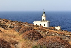 Folegandros Sights & Monuments - Aspropounta Lighthouse, located on the rocky cliffs of Folegandros, a small Greek island in the Aegean Sea, stands tall and proud against the blue sky. Its white walls and red roof gleam in the sunlight, casting a striking contrast against the turquoise sea below. The lighthouse has been guiding ships safely through the treacherous waters for over a century, a testament to its enduring strength and beauty.