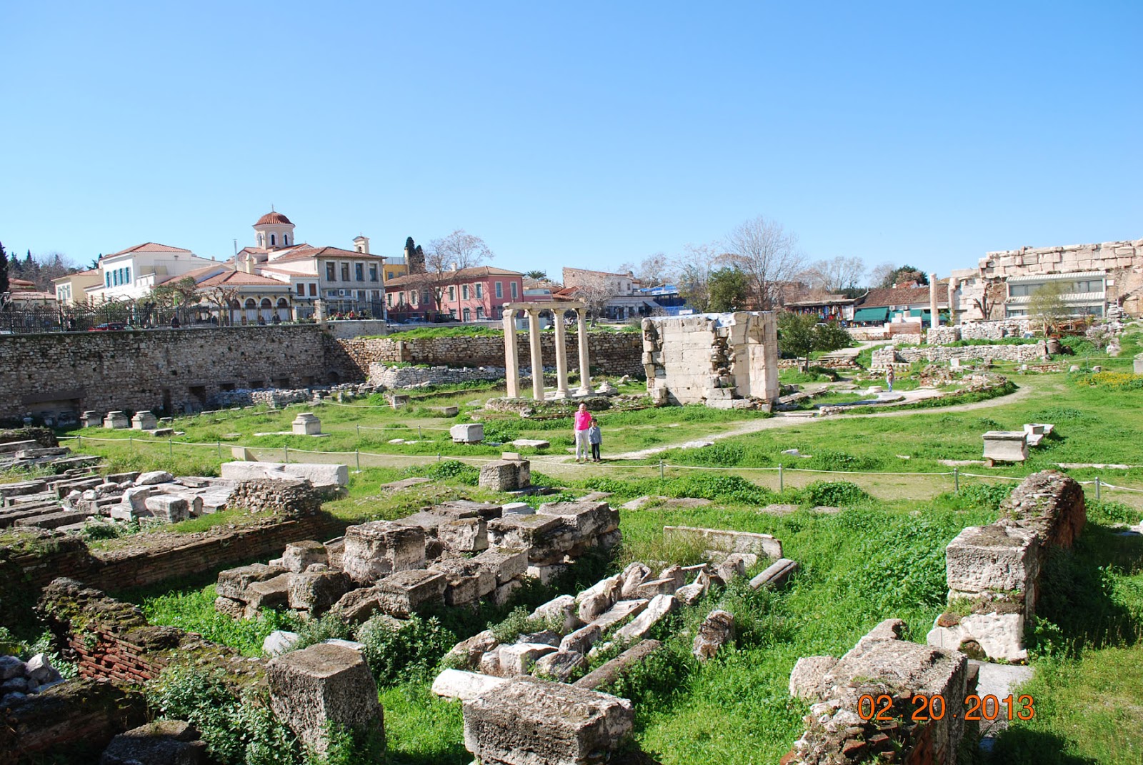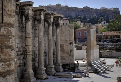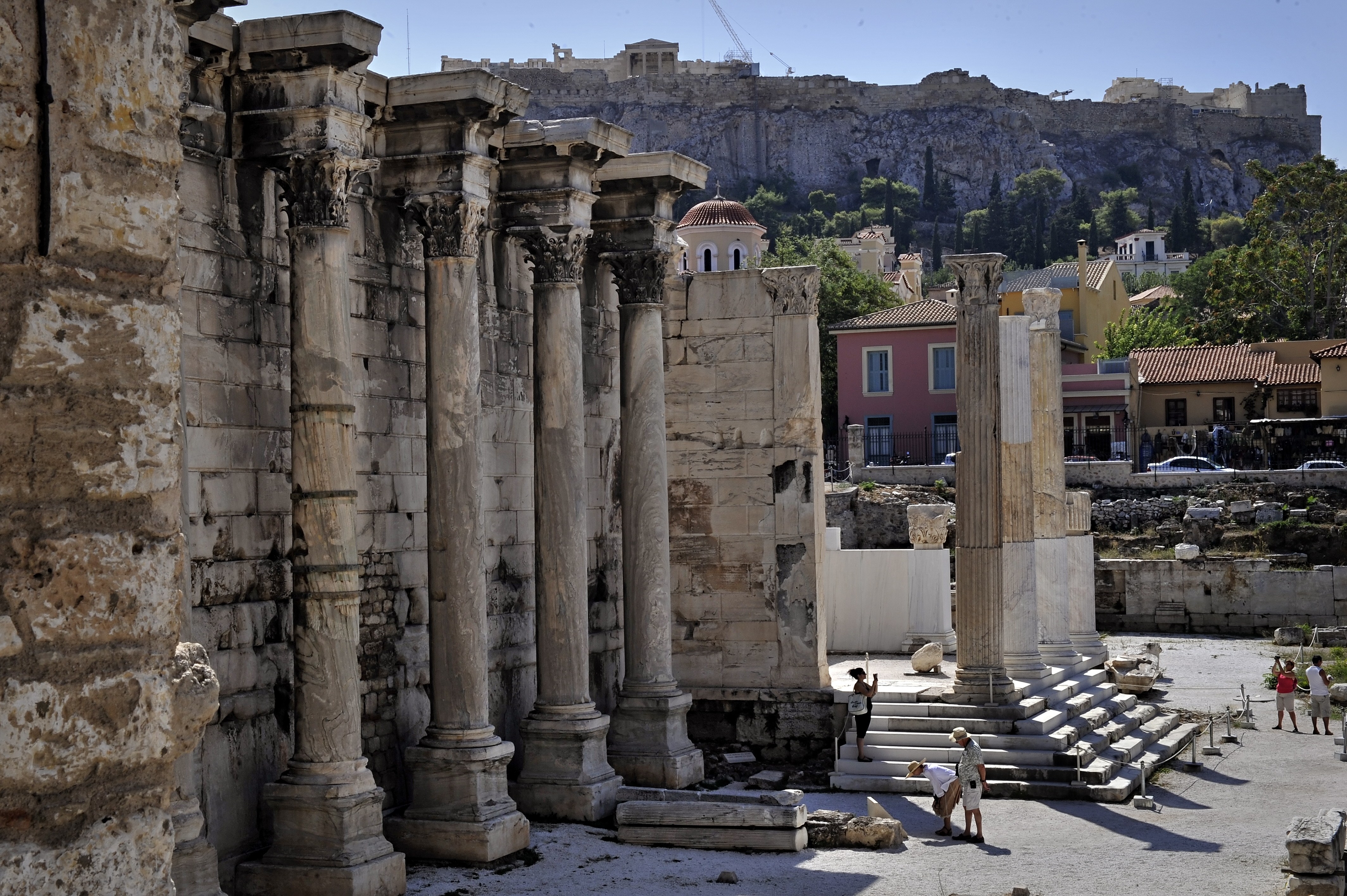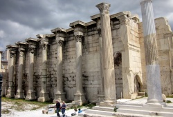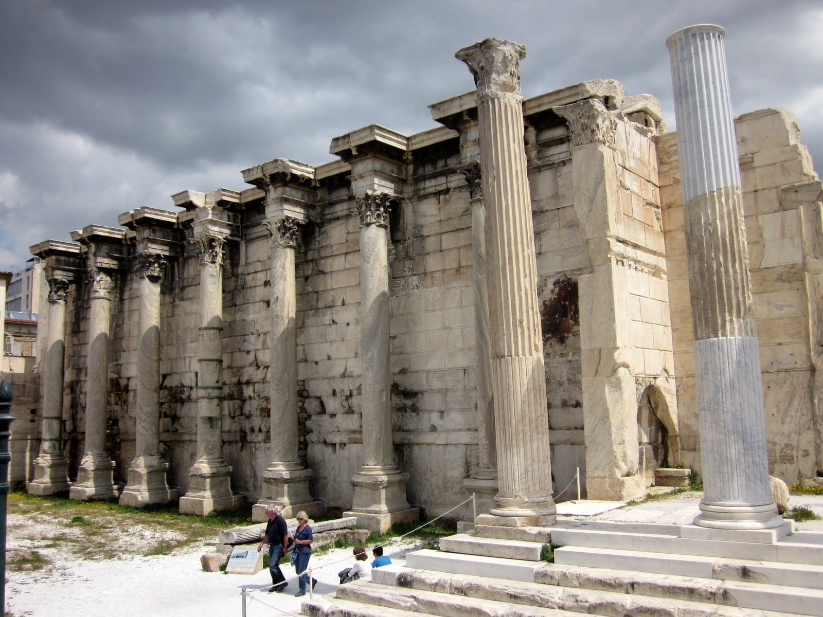 Athens Sights & Monuments - The Library of Hadrian is a grand structure located in Athens, Greece that was originally built in 132 AD by Emperor Hadrian. This historical building was once a library and was referred to as a "huge quadrangle" due to its towering walls and impressive architecture. It features 100 columns made of Phrygian stone, alabaster ceilings, and gilded rooms adorned with stunning paintings and statues. Despite being heavily damaged during the Herulian invasion of 267 AD, the library was eventually repaired between 407-412 AD. Today, the Library of Hadrian stands as a peaceful oasis amidst a bustling bazaar and boasts an inner courtyard complete with a central pool and garden surrounded by elegant marble columns. Those who visit the eastern end can explore rooms resembling an actual library, where papyrus books were once stored. These rooms also served as lecture halls and reading rooms. Although three Christian churches were later built at the site during Byzantine times, remnants of the original Library of Hadrian still survive.