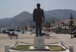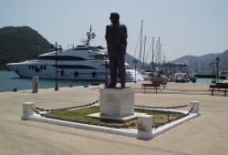 Lekada Sights & Monuments - The Aristotle Onasis Statue in Lefkada, Greece stands proudly at the Nidri port. This remarkable statue honors the legacy of the renowned Greek businessman - Aristotle Onasis, who was widely recognized as one of the wealthiest men worldwide. Notably, he frequently sailed from his private island of Skorpios to Nidri, to unwind and relish the local taverns. Plan a visit to the port, to witness the magnificent Aristotle Onasis Statue and pay homage to his contributions.