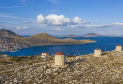 Halki Sights - The Windmills of Halki, Greece are iconic landmarks towering above Niborio. Once powered by the island's famous gusty winds, these historic structures are now retired but remain emblematic of Halki's rich past. Come witness the enduring legacy of the Windmills in Halki, Greece.
