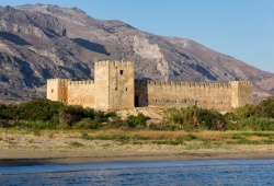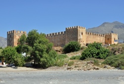 Chania Sights & Monuments - Frangokastello in Sfakia, Chania Crete is home to one of the most stunning Venetian fortresses. Built in 1371, the fortress was constructed on the beach to safeguard the Venetians against pirates and local uprisings. Known as Castel Franco to the Venetians, the Frangokastello fortress boasts big corners and square towers. A Lion of Saint Mark and two Venetian feudal coats of arms are sculptured into a slate above the main entrance. This castle is located in Sfakia, on the south coast of west Crete, just 13 km east of Chora Sfakion and west of Plakias. The village of Sfakia in Crete is highly developed, with clear waters and beautiful beaches that attract many visitors. The Turks made the last repairs to the castle in 1866.