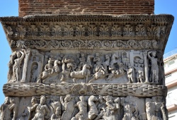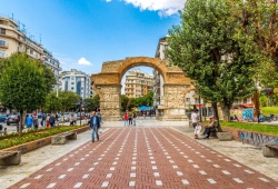 Thessaloniki Sights & Monuments - The Arch of Galerius, commonly referred to as the Kamara, is a renowned monument situated at the intersection of Egnatia and Demetriou Gounari Streets, in the heart of Navarinou Square in Thessaloniki, Greece. First constructed approximately 305 AD, this remarkable quadruple arch was part of a vast building complex, which also housed the Galerius Palace, the Hippodrome, and the Rotunda. The Kamara was originally built as a tribute to the triumphs of Emperor Galerius over the Persians. Today, the Kamara is a beloved landmark in Thessaloniki and serves as a popular passageway and gathering spot.