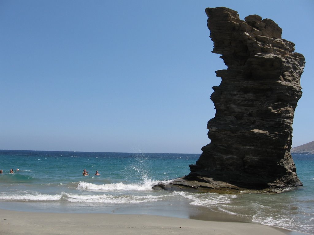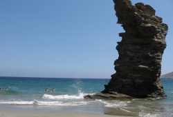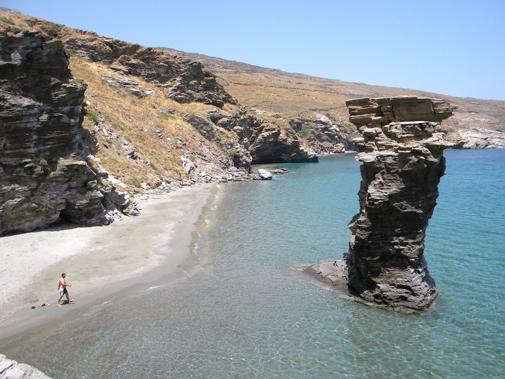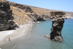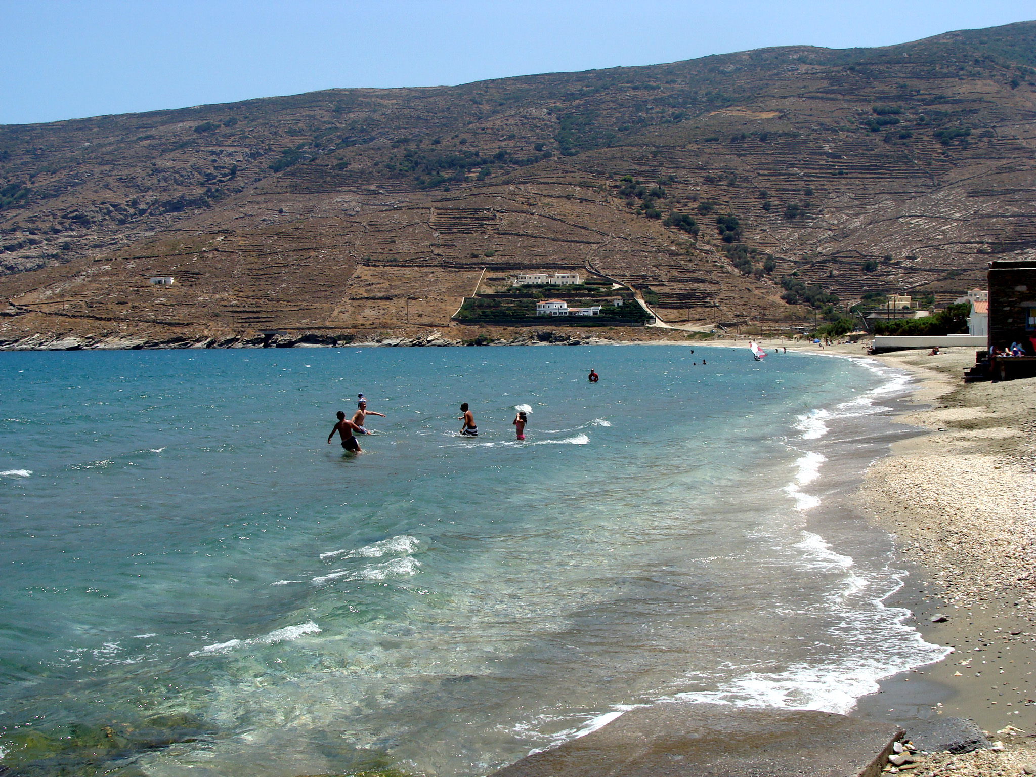 Andros Beaches - Ormos Korthi Beach in Andros, Greece boasts a vast expanse of sandy shorelines perfect for sunbathing and swimming. The beach is complemented by a large, paved boulevard and a concrete seawall that serves as a barrier against the waves. Along the seawall, visitors can find a collection of rocks acting as a natural buffer. While there are a few scattered cafes and taverns serving local dishes, the beach is relatively simple. However, it's important to note that swimming can be challenging due to the numerous concrete wharfs at the far end of the boulevard where boats frequently take refuge. Although shade and provisions are scarce, visitors can bring towels and umbrellas. Nearby, at the settlement of Ormos Korthi, visitors can explore a local folk museum, which hosts live performances during the summertime festivities.