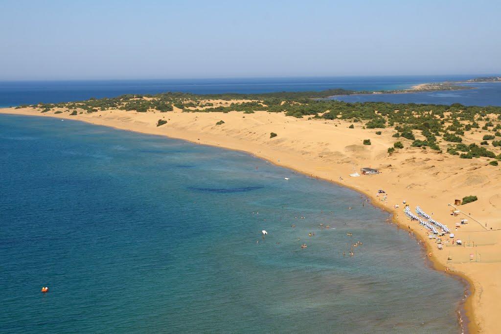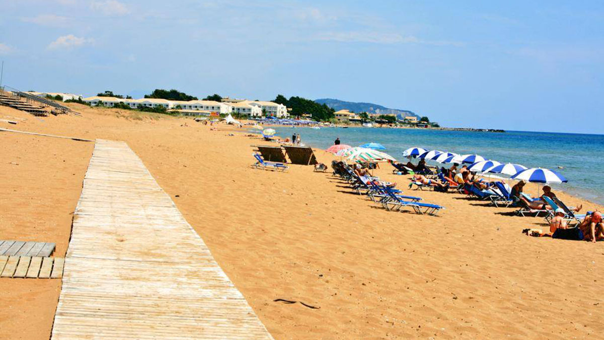 Corfu Beaches - Issos Beach in Corfu, Greece is a stunning southern gem. Boasting a stretch of soft, sandy shores and glistening, crystal-clear waters, this family-friendly destination offers everything from top-notch facilities to a reliable lifeguard tower. Braving the often-high winds, windsurfers and kitesurfers flock to this beach, while nearby bars and taverns provide delectable dining options. Come experience the magic of Issos Beach in Corfu, Greece.