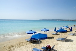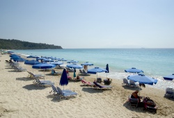 Kefalonia Beaches - Lourdas Beach in Kefalonia, Greece, is a stunning destination situated 17 kilometers southeast of Argostoli. This immensely popular beach boasts a plethora of facilities that cater to all your needs. The beach is set against breathtaking green landscapes and magnificent waterfalls cascading down from the mountains. Rent umbrellas and sunbeds for a comfortable stay at Lourdas Beach. Commuting to this beach from Argostoli is very convenient with public buses readily available. Plan a visit to Lourdas Beach in Kefalonia for an unforgettable experience.