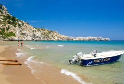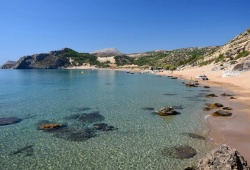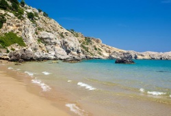 Rhodes Beaches - Tsambika Beach, located 25 km south of Rhodes town, is a stunning sandy beach situated beneath the magnificent rock where the miraculous Monastery of Tsambika stands. This beach offers a picturesque scenery with turquoise waters and golden sands, making it the perfect place to enjoy the sun and relax. Additionally, Tsambika Beach provides an array of colorful beach facilities and water sports for the adventurous. With its welcoming atmosphere and abundant amenities, the wider region of Kolymbia in Rhodes is an ideal destination for both daytime and nighttime activities. Book your trip to Tsambika Beach in Rhodes, Greece today!