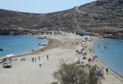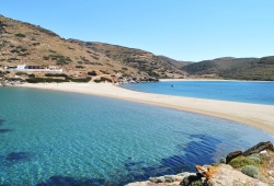 Kythnos Beaches - Kolona Beach in Kythnos, Greece is a breathtaking destination located on the northwest side of the island. This stunning beach is comprised of two separate beaches, connected by a narrow strip of sand that links the islet of Agios Loukas to Kythnos. While there are no amenities available, visitors can take advantage of the shade provided by two large trees. Accessing this secluded paradise requires a rugged jeep ride or a scenic hike. Alternatively, Kolona Beach can also be reached by boat for a truly picturesque experience. Don't miss the opportunity to visit Kolona Beach during your travels to Kythnos, Greece.