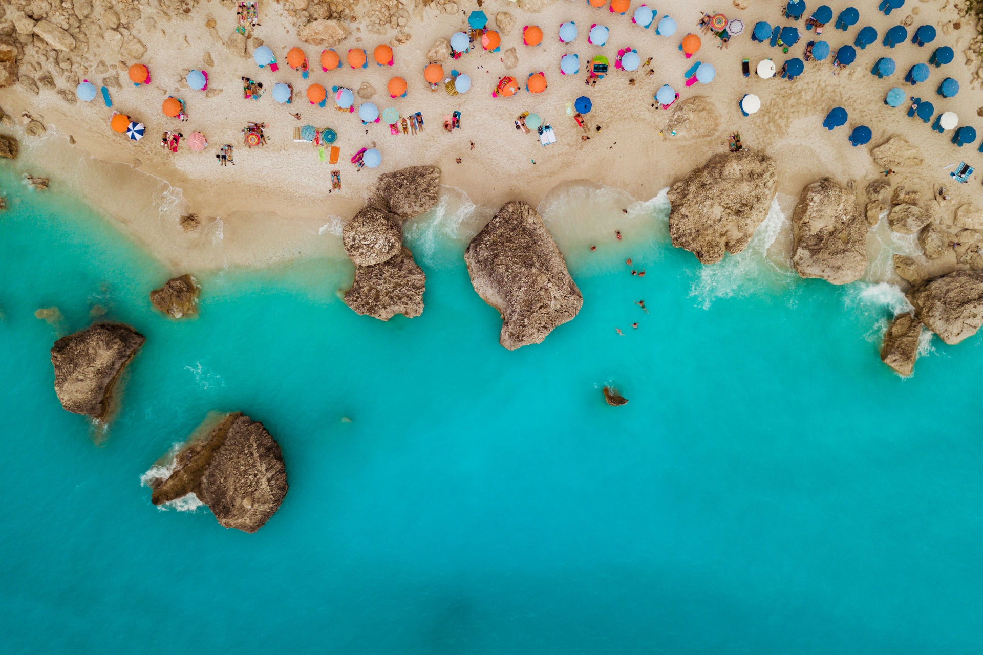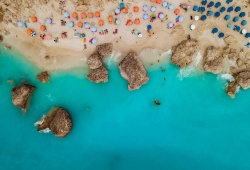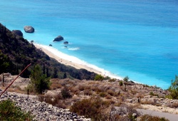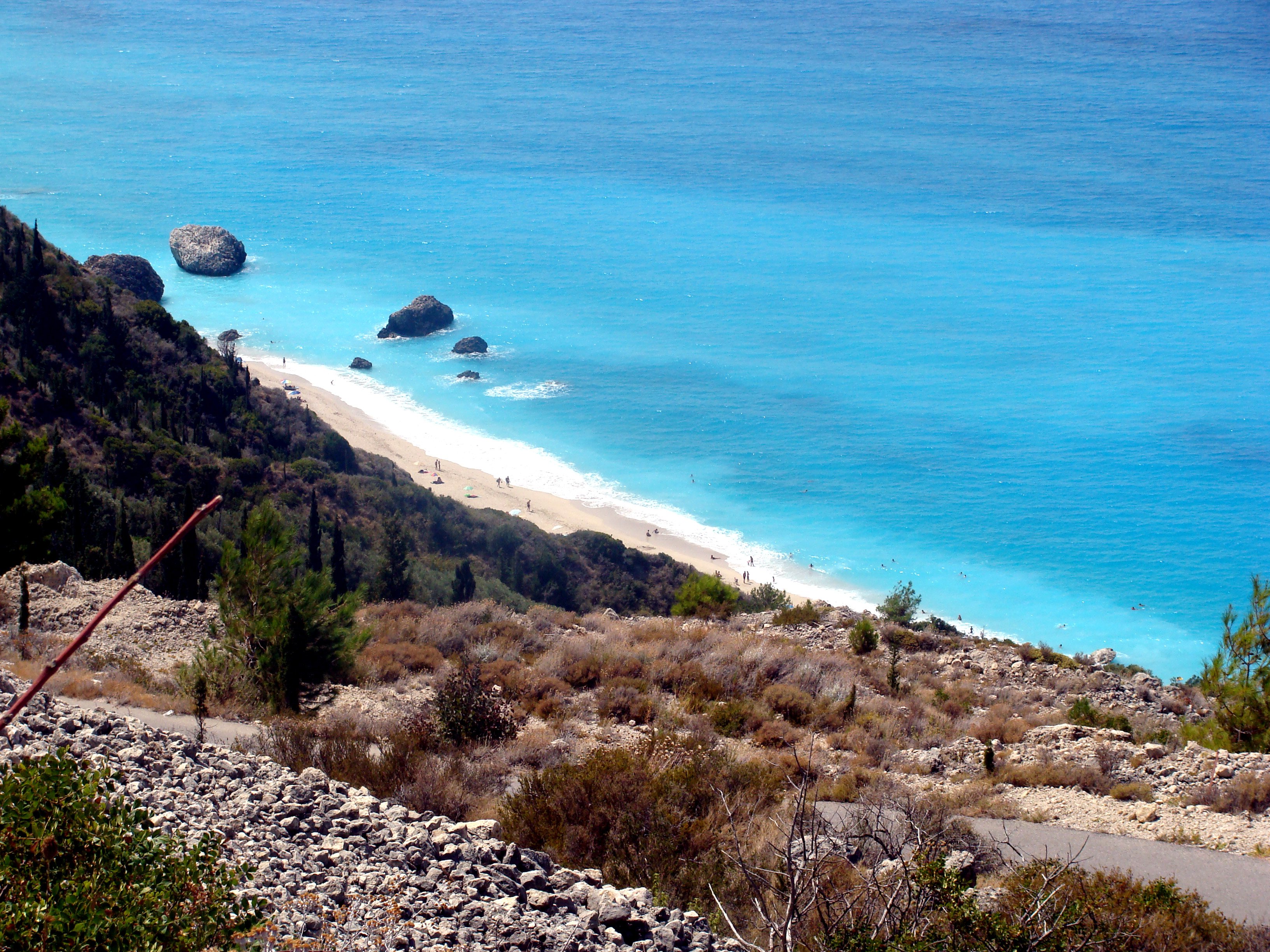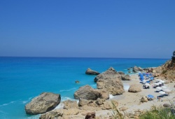 Lefkada Beaches - Megali Petra Beach in Lefkada, Greece, owes its name to the impressive rock formations that dot its shoreline. Situated just 15km west of town and near Kalamitsi, this partially organized beach is equipped with sunbeds and umbrellas, making it a perfect spot for privacy and relaxation. However, it's important to exercise caution, especially with children, as the area can be deep and winds are common. Discover the beauty and tranquility of Megali Petra Beach in Lefkada, Greece.